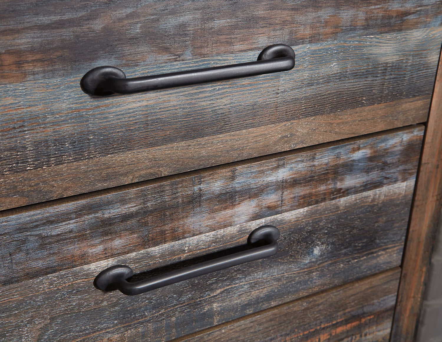 When merged in just the right way, rustic and industrial styles can make one happy marriage. Case in point: this dresser and mirror set. A refined take on barn board beauty, its complex, replicated wood grain showcases hints of burnt orange and teal tones for a sense of weatherworn authenticity. Elongated metal drawer pulls elevate the aesthetic.