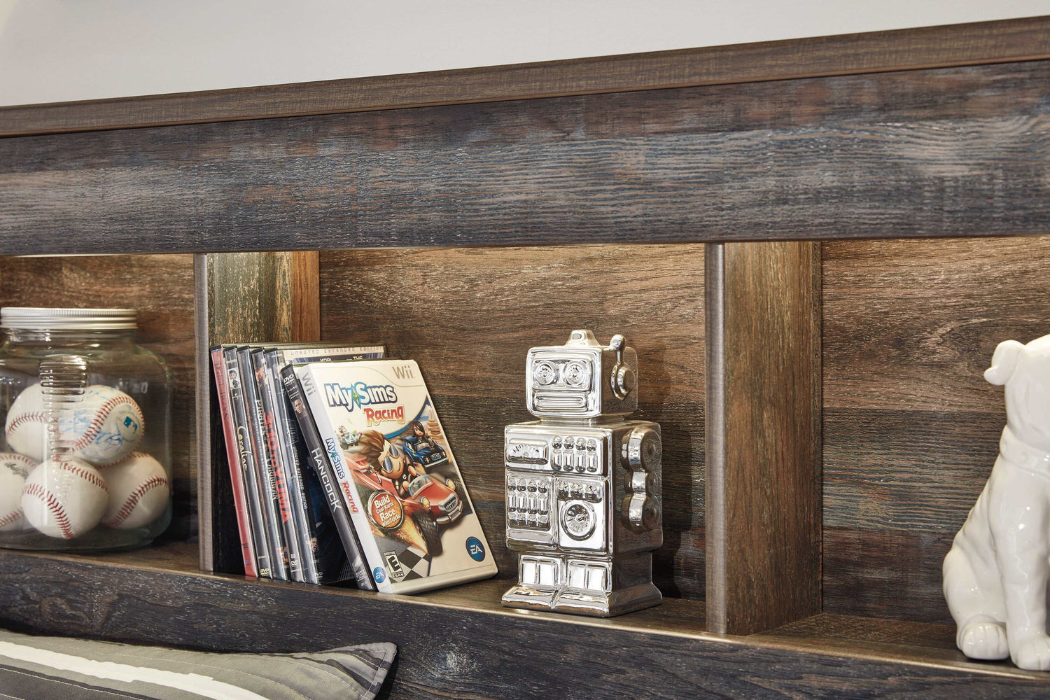 When merged in just the right way, rustic and industrial styles can make one happy marriage. Case in point: this queen bookcase bed with storage. A refined take on barn board beauty, its complex, replicated wood grain showcases hints of burnt orange and teal tones for a sense of weatherworn authenticity. Three open cubbies lined with a dimming LED light strip keep bedtime reads at the top of mind. Underneath the bed: are four smooth-gliding drawers and four open cubbies that accommodate casually cool storage bins.