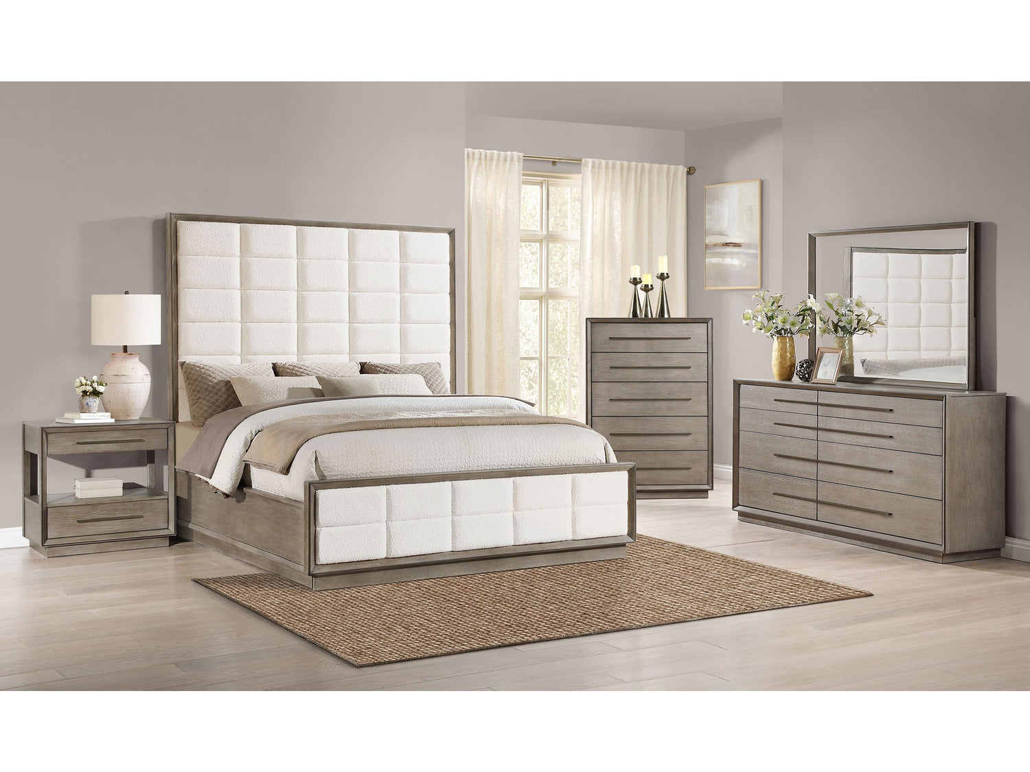 - Includes: One (1) eastern king bed, one (1) nightstand, one (1) dresser, one (1) dresser mirror, and one (1) chest- Refined, approachable style is the hallmark of a modern Five piece upholstered bedroom set