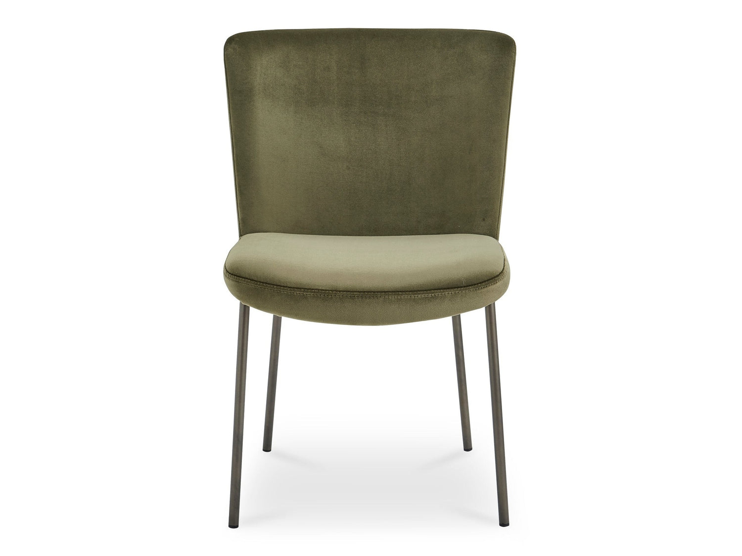 The Early dining chair is an elegant fusion of minimalist design and comfort that features a slim metal frame in a blackened bronze finish. Its seat and comfortably curved back are upholstered in durable faux mohair that resembles velvet’s soft allure but is easier to maintain. It complements any dining setting, especially alongside wooden tables, presenting a clean, cohesive look that invites sophisticated ease.