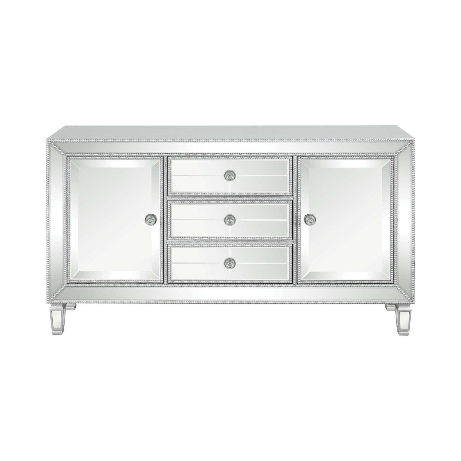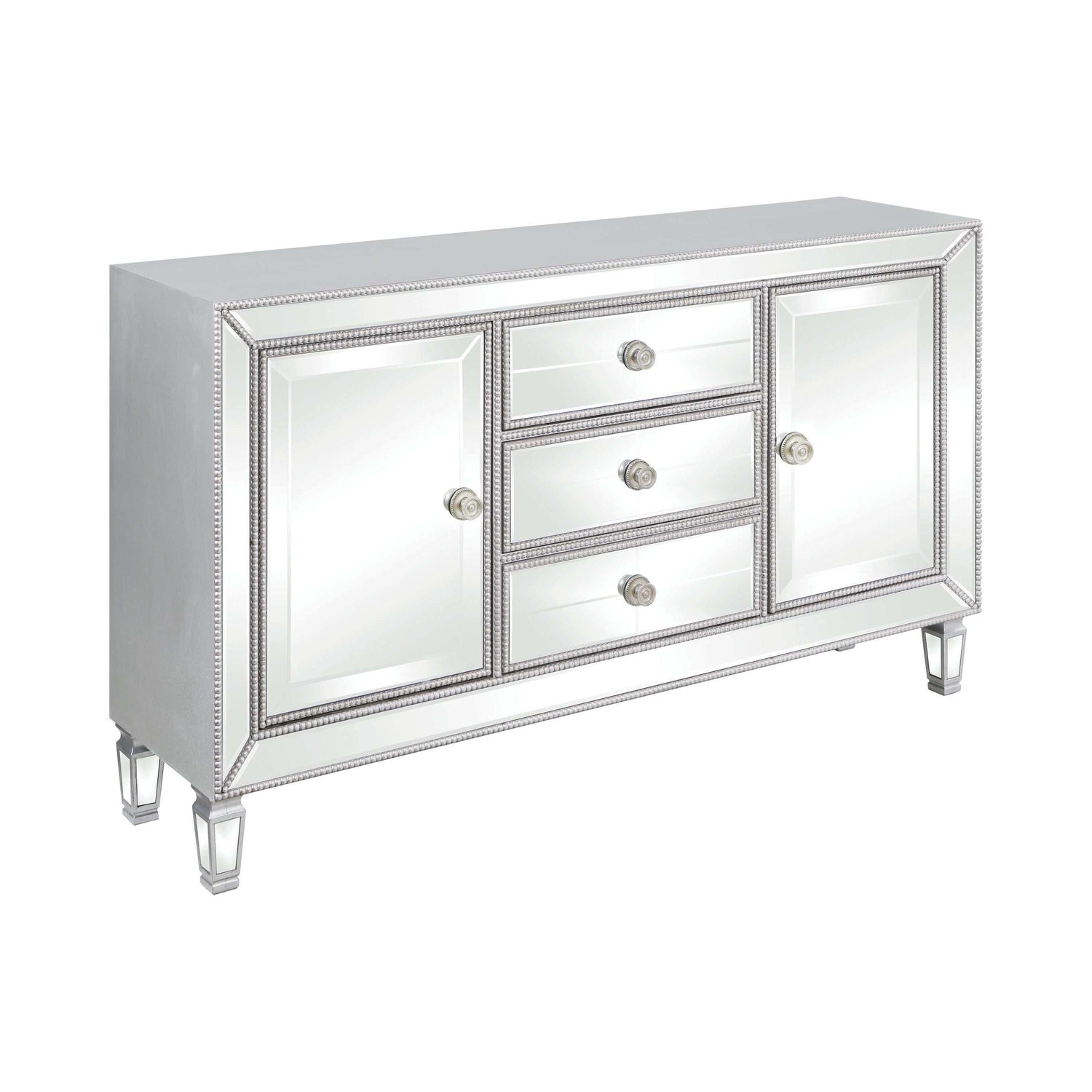 - Front mirror doors dress and three center drawers dress up this contemporary accent cabinet