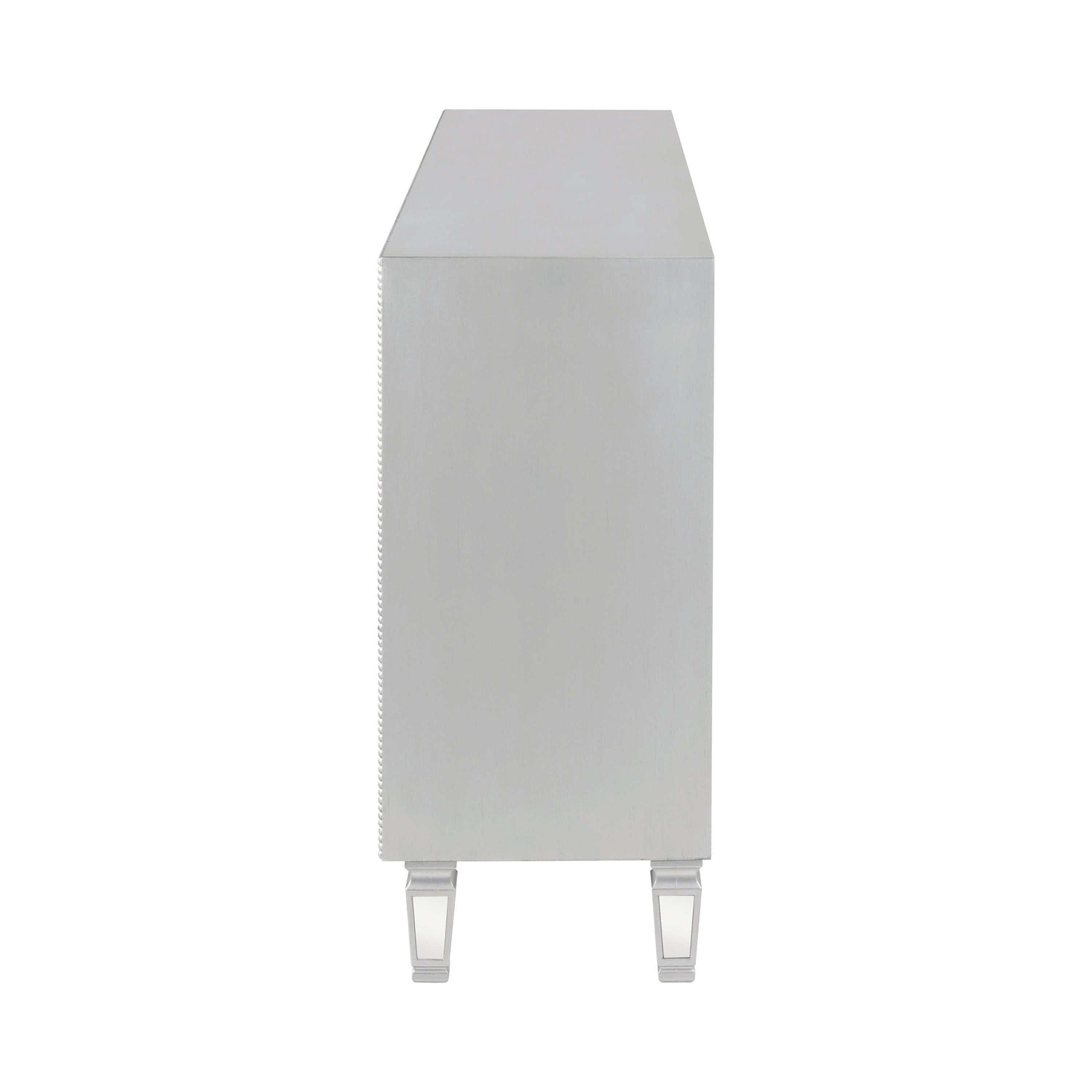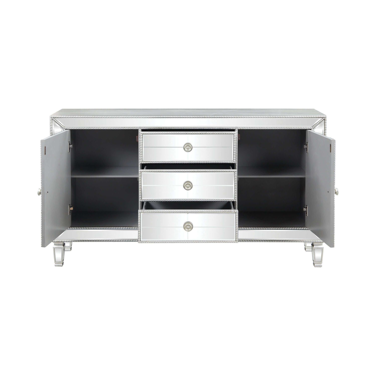 Bright and reflective, this stunning accent cabinet opens up living and dining rooms. With a brilliant champagne finish, the clean silhouette is full of structure. The front and tapered legs feature mirror-like fronts that dazzle and delight. Complete with three drawers and two doors, the beaded frame mirrors the intricacy of the rounded hardware. Beautiful with a vase of fresh flowers, this cabinet adds glamour to the smallest of spaces.