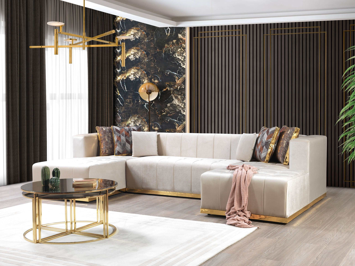 Introducing Elisha, double chaise velvet sectional, a masterpiece of modern elegance and comfort. The velvet upholstery of this minimal sectional is both soft and durable.Featuring channel tufting, this sectional exudes a sense of luxury and refinement.To further elevate your comfort, we have included six designer pillows in this modern sectional.