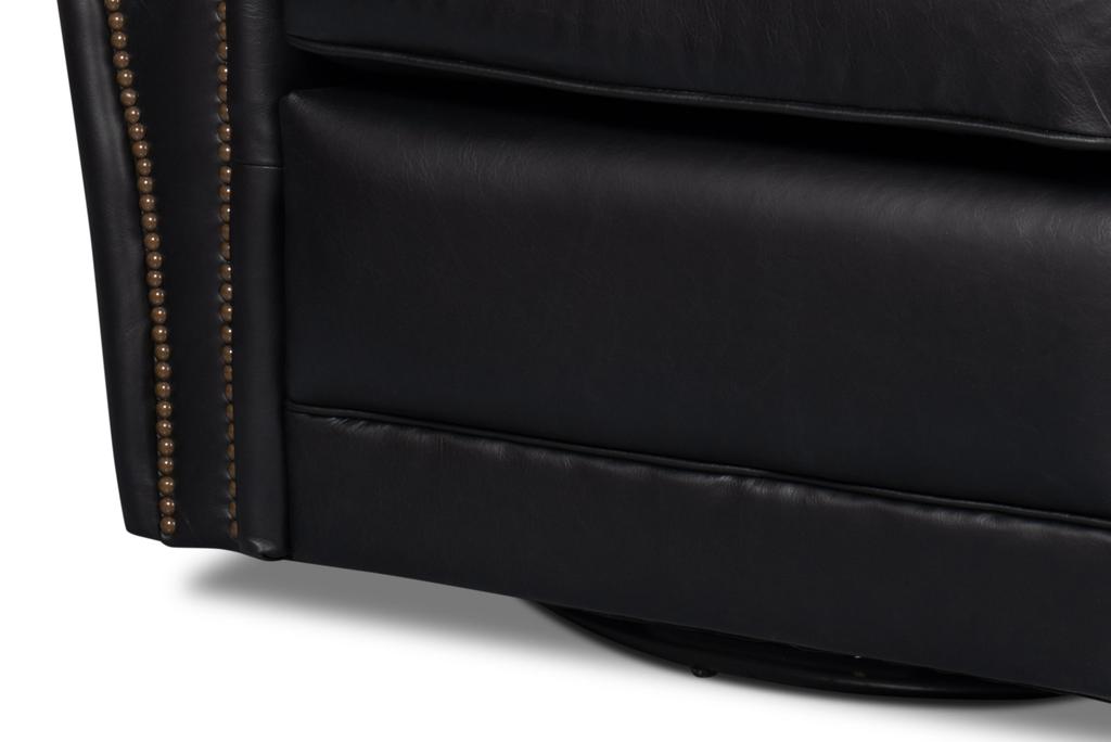 The Elite Black French Club Swivel Chair is a club swivel chair constructed from Top Grain Cow Leather in Onyx Black that provides adaptable seating with a swivel mechanism. This design reinterprets a classic Paris flea market find with contemporary scale. It works well in any room, functioning as a single seat or in pairs.