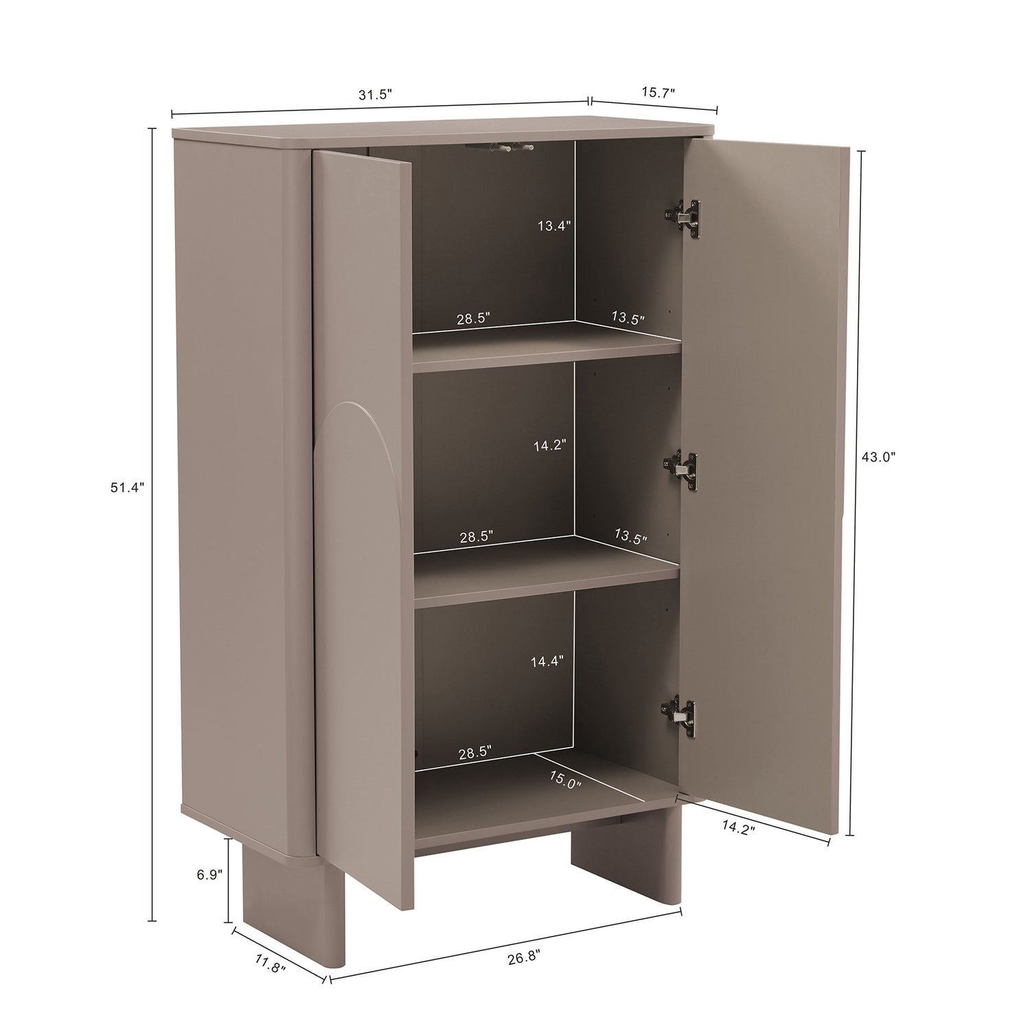 - Upon assembly, Accent Cabinet Dimensions Measure: 31.5 in. Length, 51.4 in. Height, 15.7 in. Depth.