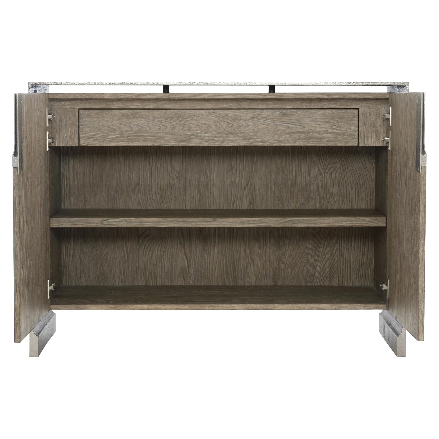 - Cast Aluminum door pull in Shiny Nickel finish. Two concealed hinge soft-close doors. Behind doors are one soft-close drawer with finger pull, one adjustable/removable shelf, and bottom shelf surface. Bernhardt name plate in left drawer.
