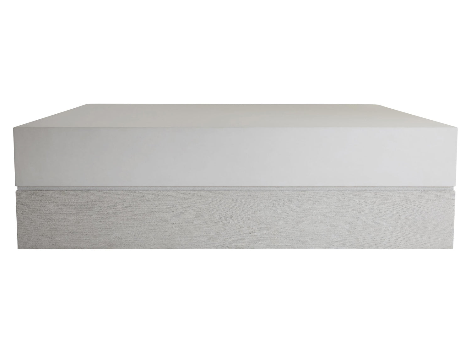 - Pitted faux stone in Adobe finish on top section, quartered ash wood reveal and bottom section in Sandblasted White finish