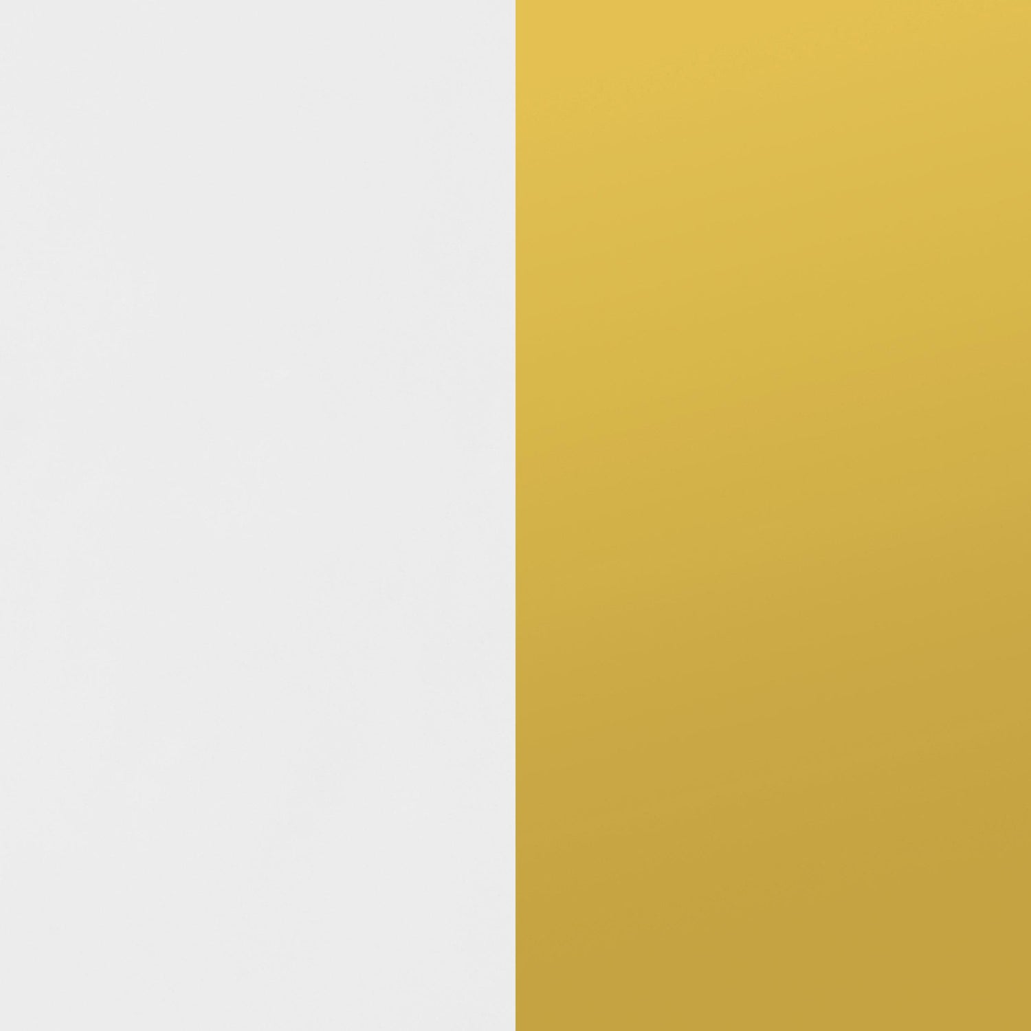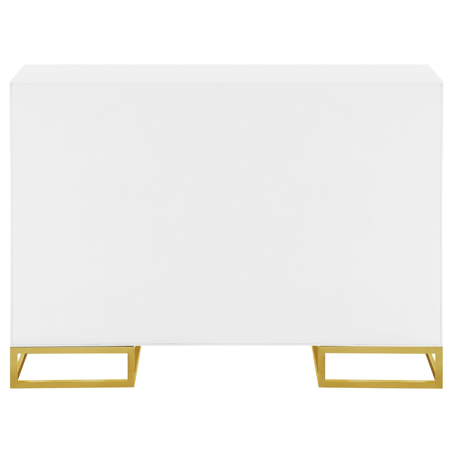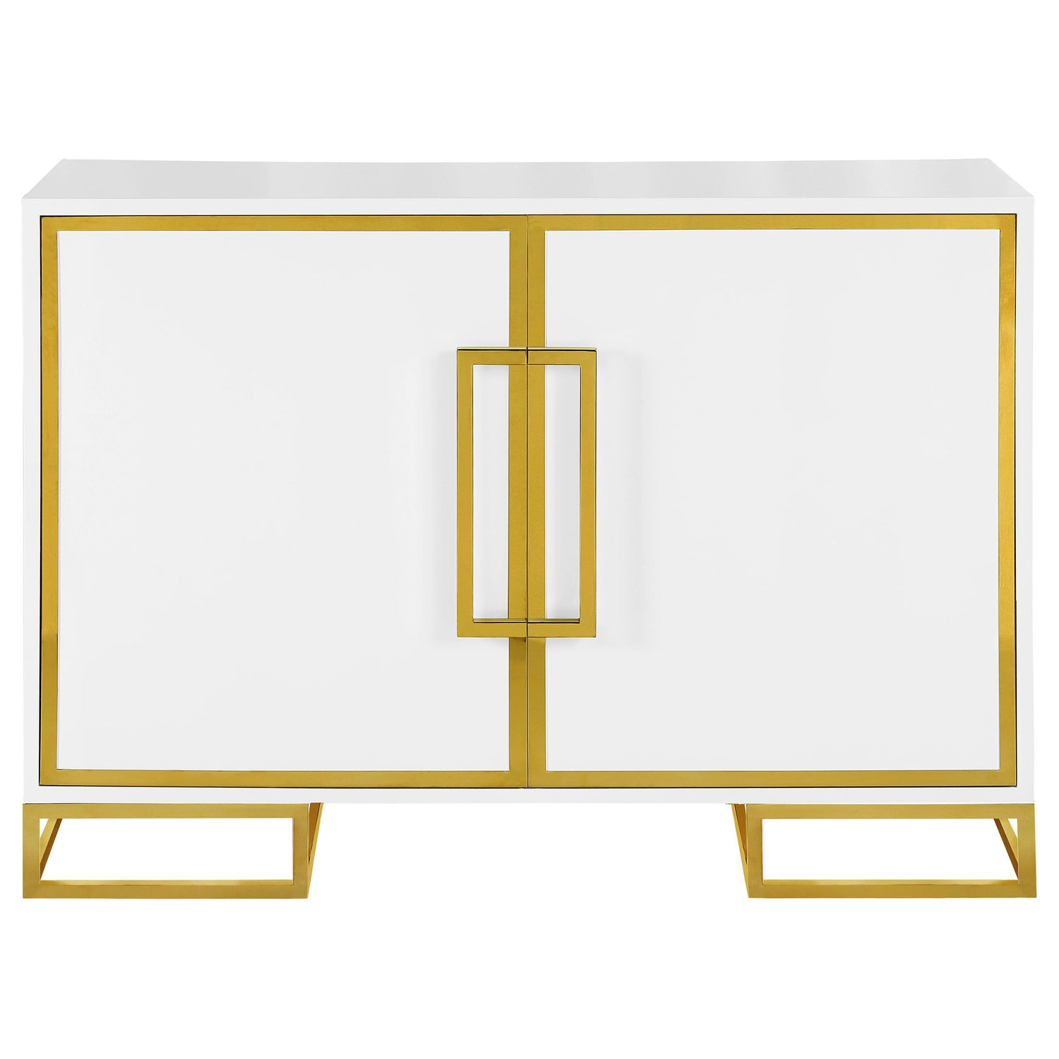 - Sleek accent cabinet with bright white finish and glamorous gold trim