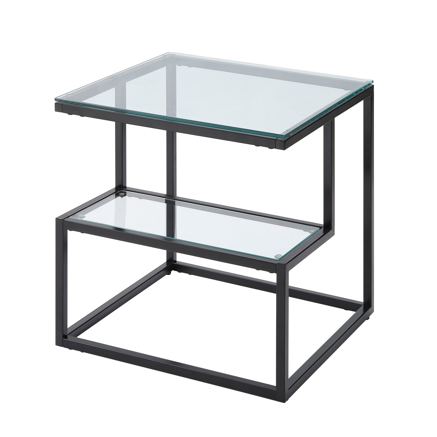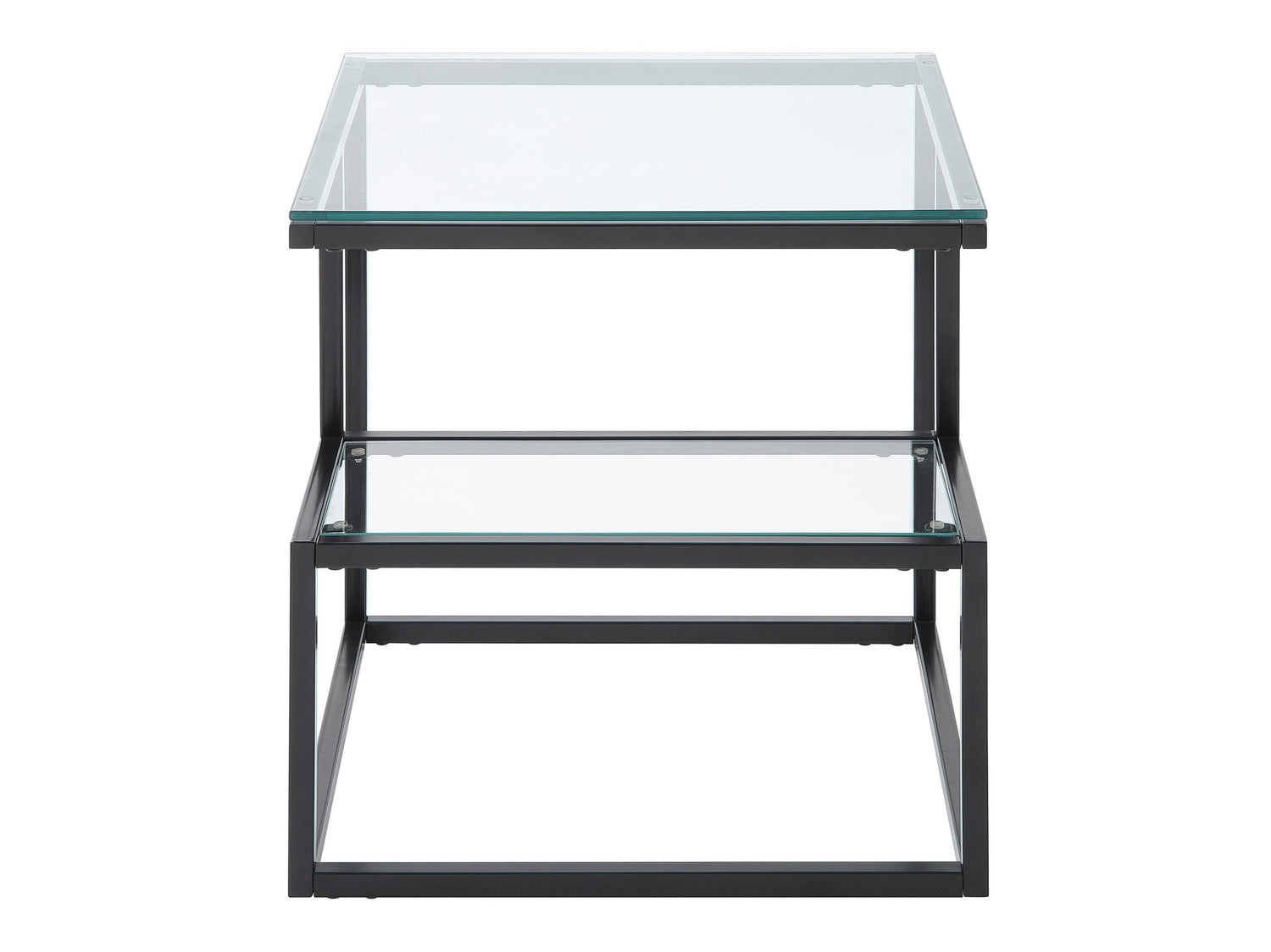 Black metal frames the planes of the Elyria Collection’s end table, each line providing support to the dual level glass tabletops. The linear profile creates a complement your living room’s modern aesthetic.