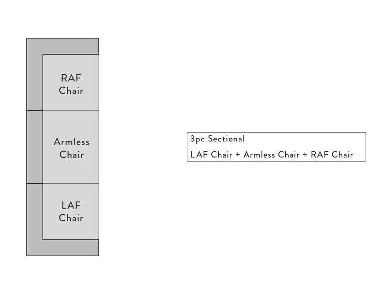 - Includes 3 pieces: left-arm facing corner chair, armless chair and right-arm facing corner chair.