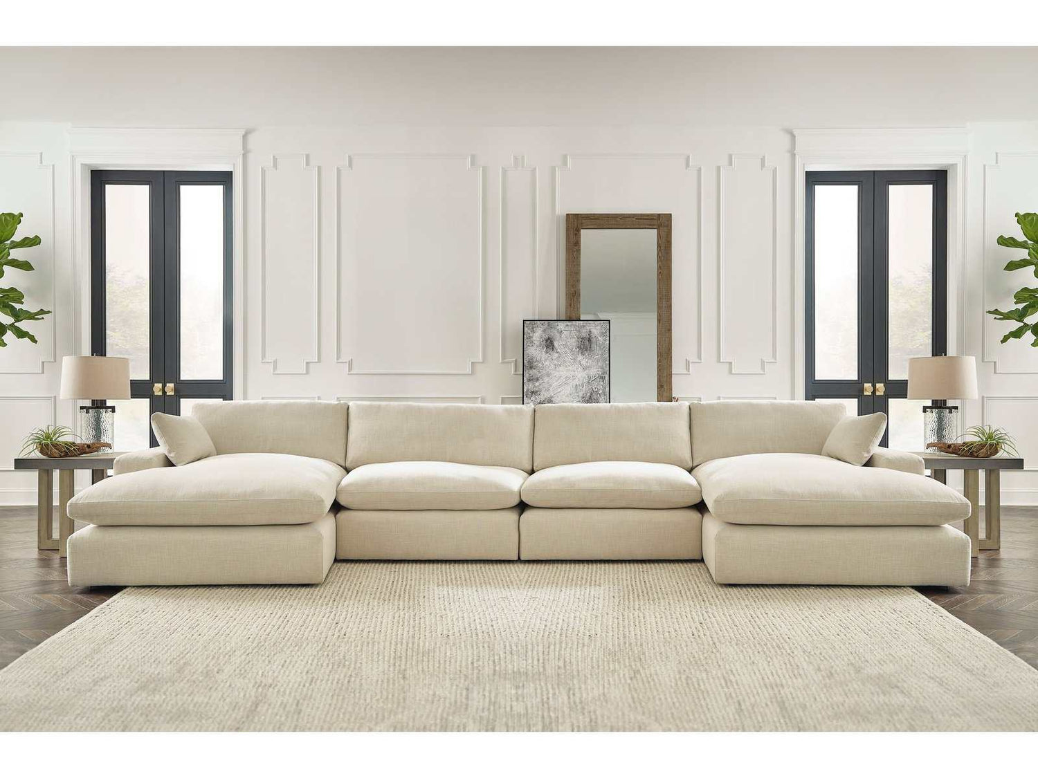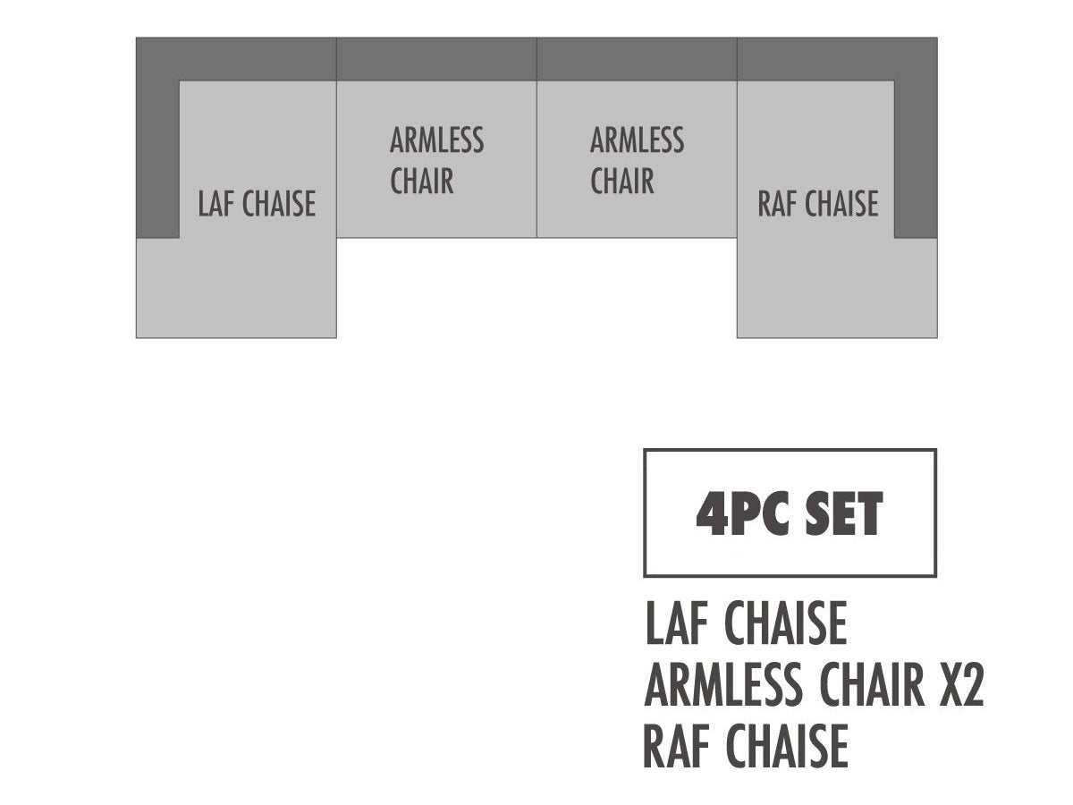 - U Shape Sectional Includes 4 pieces: left-arm facing corner chaise, 2 armless chairs, and right-arm facing corner chaise.
