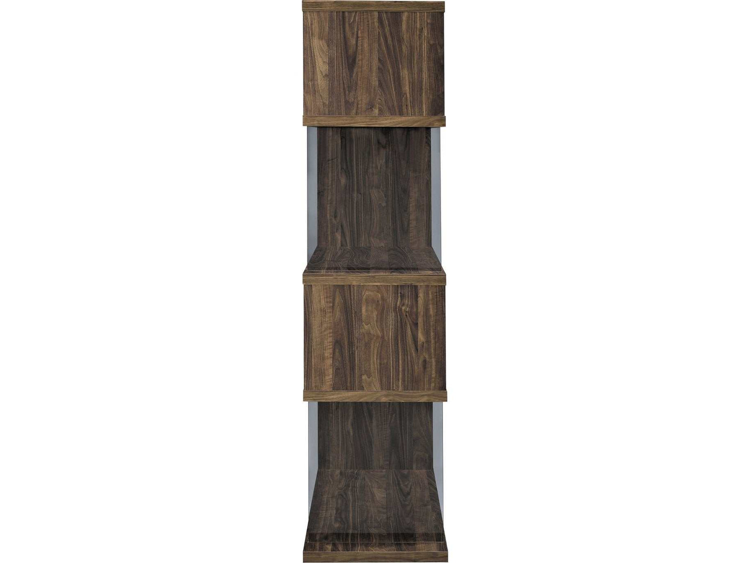 Elegant, asymmetrical lines merge to create this contemporary bookcase, a perfect additional way to showcase items in a room. Five open shelves in an aged walnut finish lend a mid-century vibe, supported by semi-transparent, smoked glass side panels that lend a modern flair. Perfect for home offices, living rooms, and much more, this zig-zag design bookcase showcases book collections, decor, and other favorite items for all to see. With a flush base, this open bookcase unit rests sturdily and securely on the floor. Clean lines and an impressive jagged appearance lend a focal point to any room.