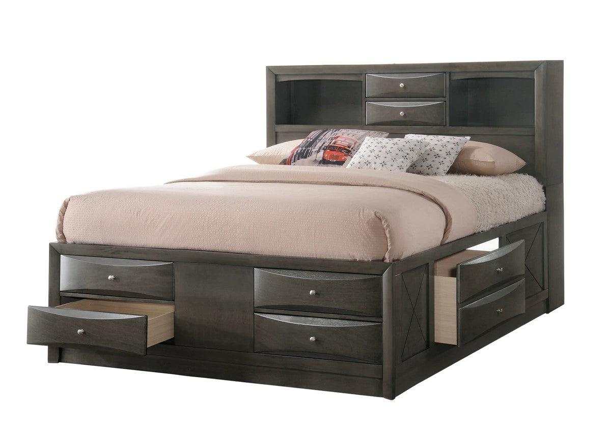 Stay organized with the attractive Emily Collection by Elements Furniture. Its contemporary, contoured drawers give it a custom look. Plenty of storage is provided throughout all case pieces as well as on all sides of the bed. This bed is sure to add functionality and beauty to any room.