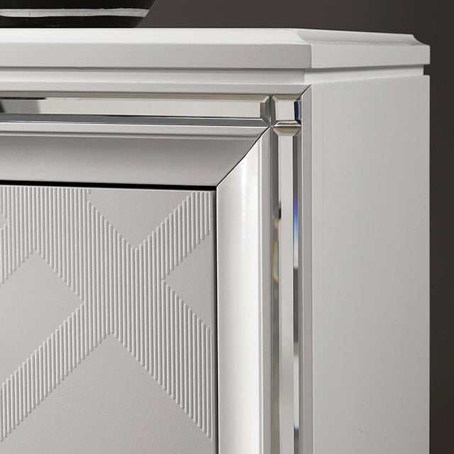The enticing combination of glamour and Art Deco has long been attempted, but rarely with such successful results as achieved with this set. It is a visual masterpiece, harkening to the days of Old Hollywood while establishing a rich, dynamic concept for the bedroom. The embroidered padded headboard shines as if illuminated. The jewel-carved faux glass feet support the components with regal authority. Classic embossed patterns tie the set together in one magnificent and highly desirable theme.