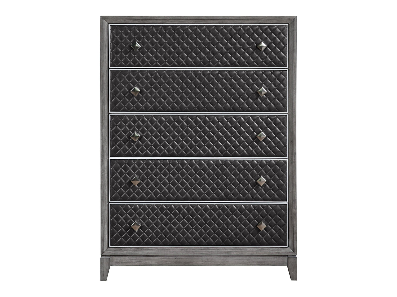 Modern styling is achieved by pairing classic design elements with eye-catching bold lines culminating in the chic look of the West End Collection. Painted silver accent subtly frames the diamond-patterned gray faux leather fronts of the chest, each providing complementing contrast to the gray wire-brushed finish of the collection’s birch veneer. Square nickel finished hardware fronts each drawer, furthering the modern look of the West End Collection.