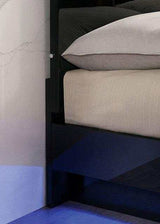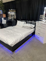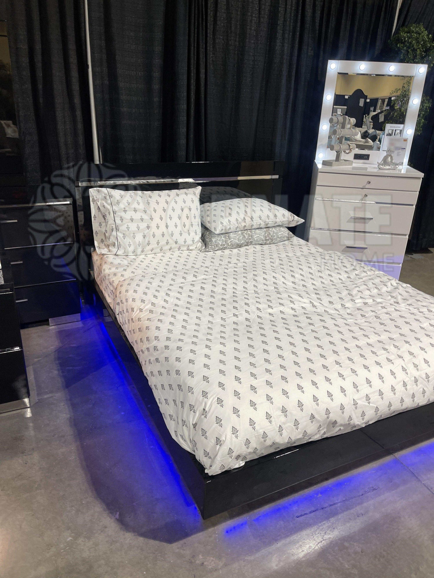 Be ready to set the right mood anytime with this tantalizing bedroom set. The main draw here is of course, the ambient LED lighting lining the bottom edges of the platform bed, reminiscent of neon lights of the olden days. Reflecting light beautifully to add to the daring environment, the chrome accents on the headboard match those of the case goods. Finished in sleek, glossy black, this ensemble is a testament to the enduring allure of futuristic settings amped with nostalgic flair.