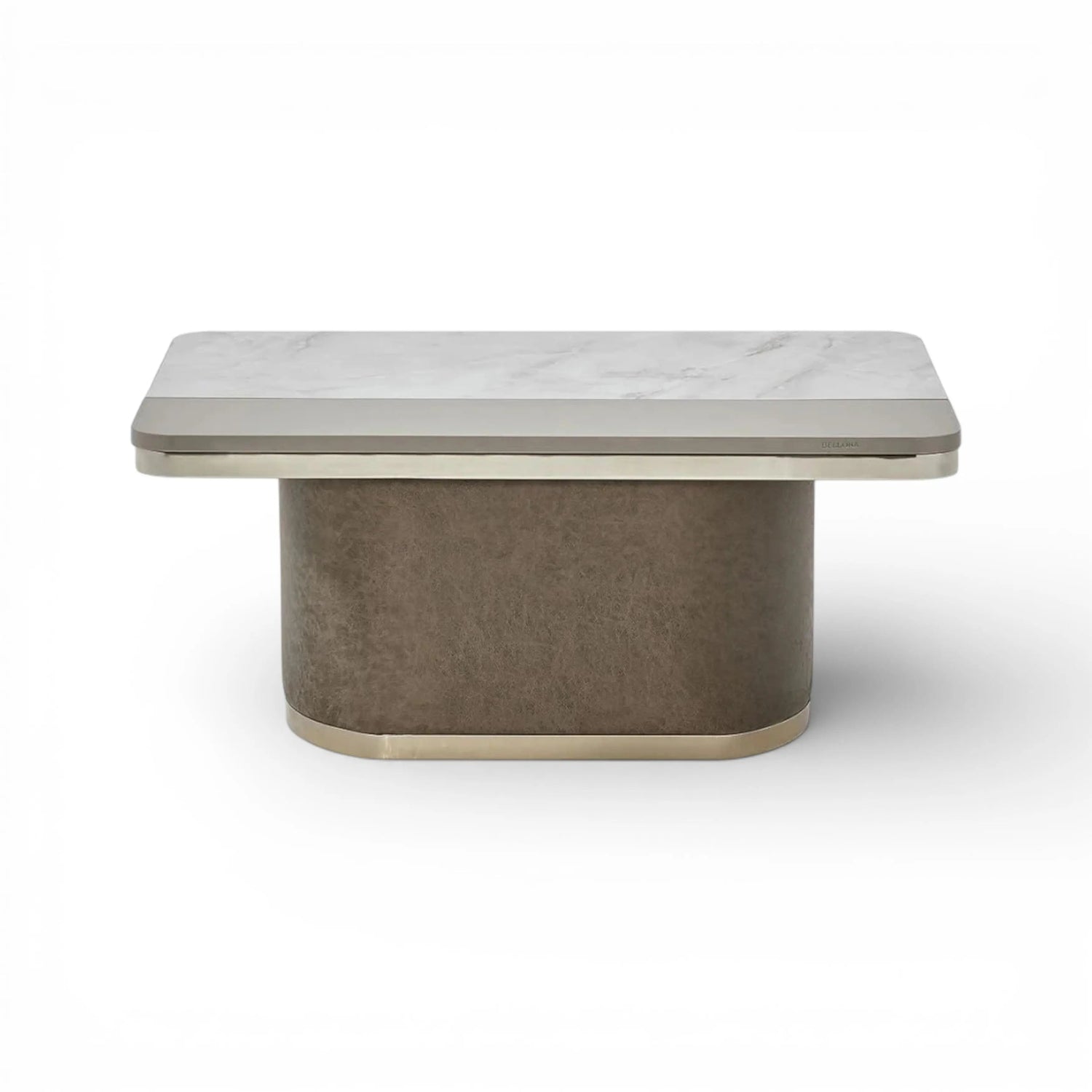 The Estella Large Coffee Table combines a sleek marble-look top with a soft metallic base, creating the perfect harmony between contemporary design and timeless elegance. Its bold geometric form and plush suede-textured body add depth and character to any living space.