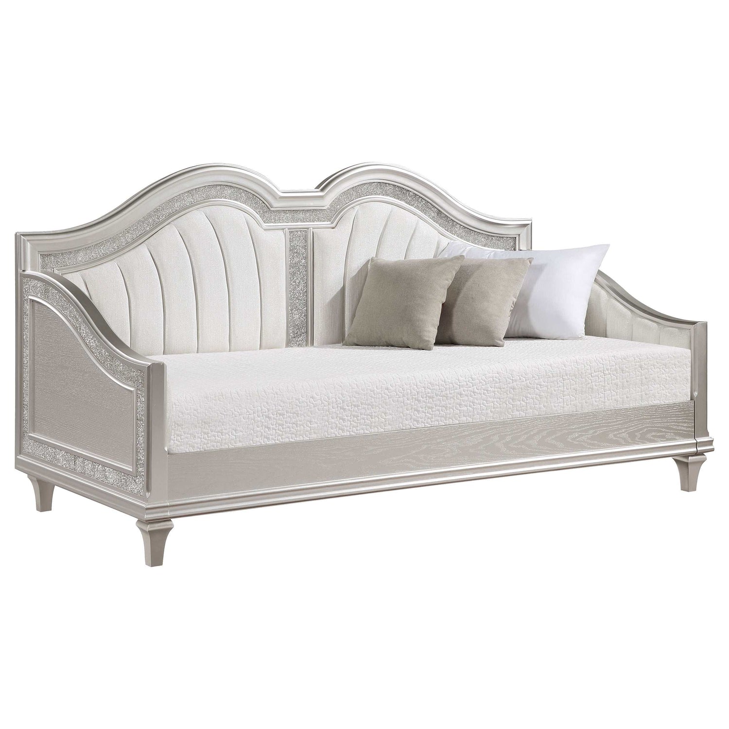 This luxurious daybed from the Evangeline collection is perfect for accommodating overnight guests or creating functional small spaces. Its eye-catching and versatile design, with a curved silhouette and faux diamond trim, adds a touch of elegance to any room.