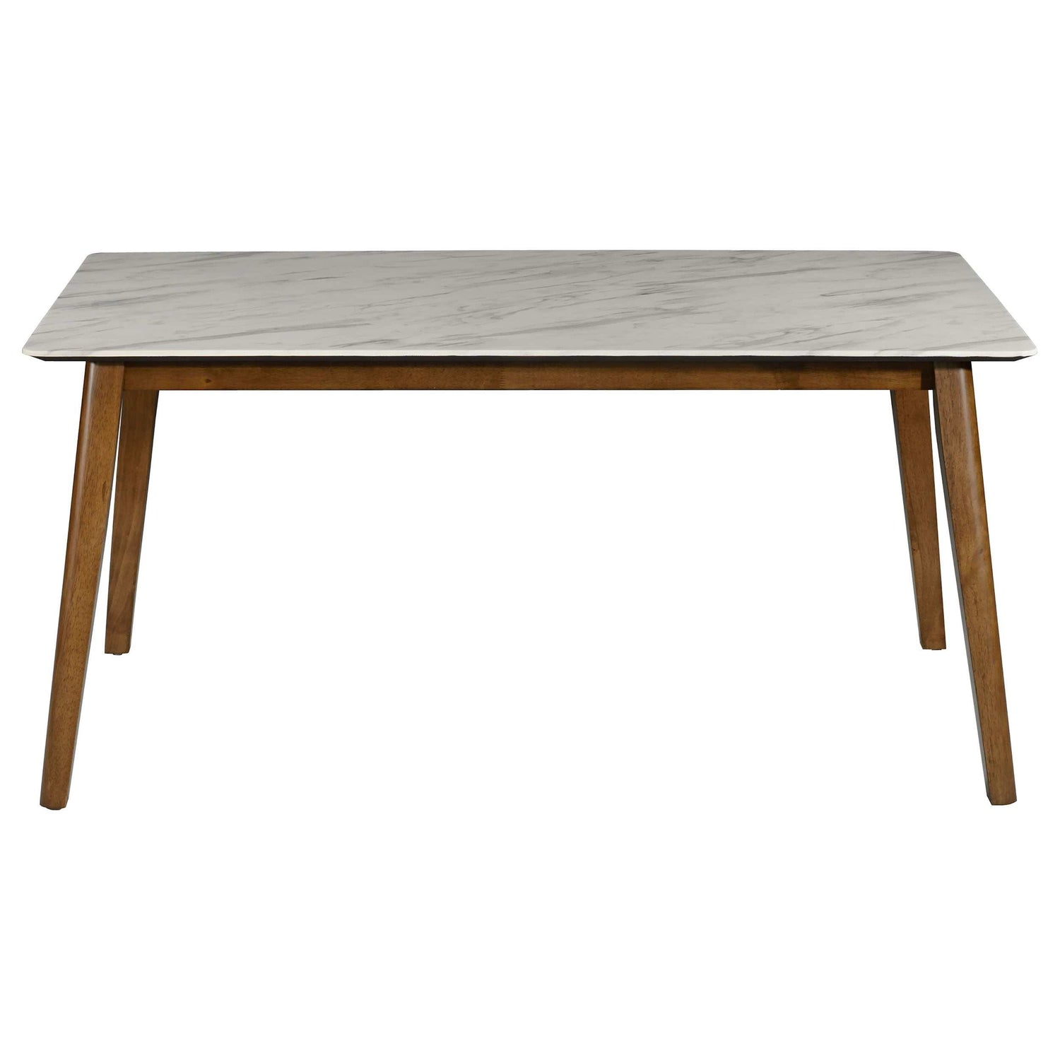 A festive mix of Euro style and Mid-Century Modern Americana merge to create a pleasing look that upgrades your casual dining space. With a faux marble rectangular tabletop, its glam factor raises a bit and draws attention. Tapered, rounded legs made of natural walnut finish wood coordinate with charmingly angled chair frames that include a sleek rounded back. Upholstered seat cushions bring a soft look to this set. Includes a dining table and six armless side chairs.