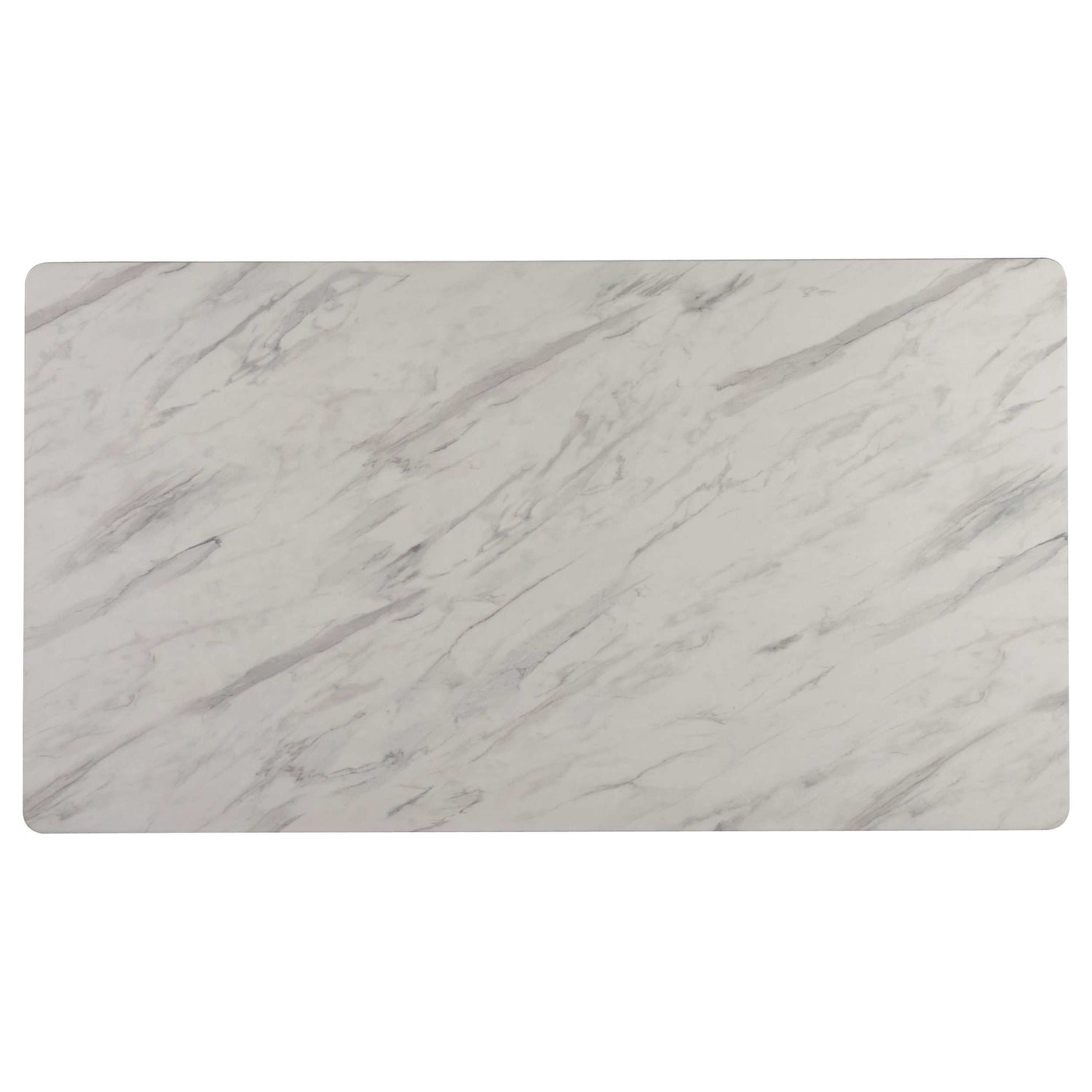 Faux marble rectangular tabletop and natural walnut finish wood legs create a festive mix of Euro style and Mid-Century Modern Americana for an upgraded casual dining space