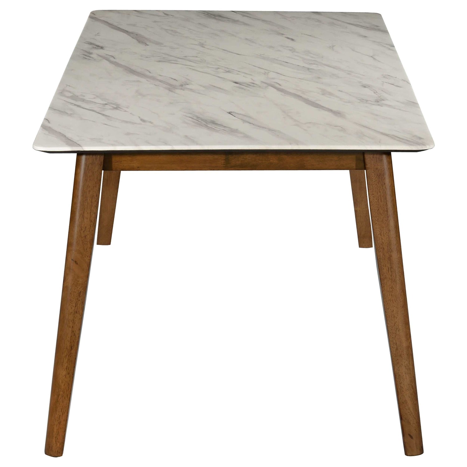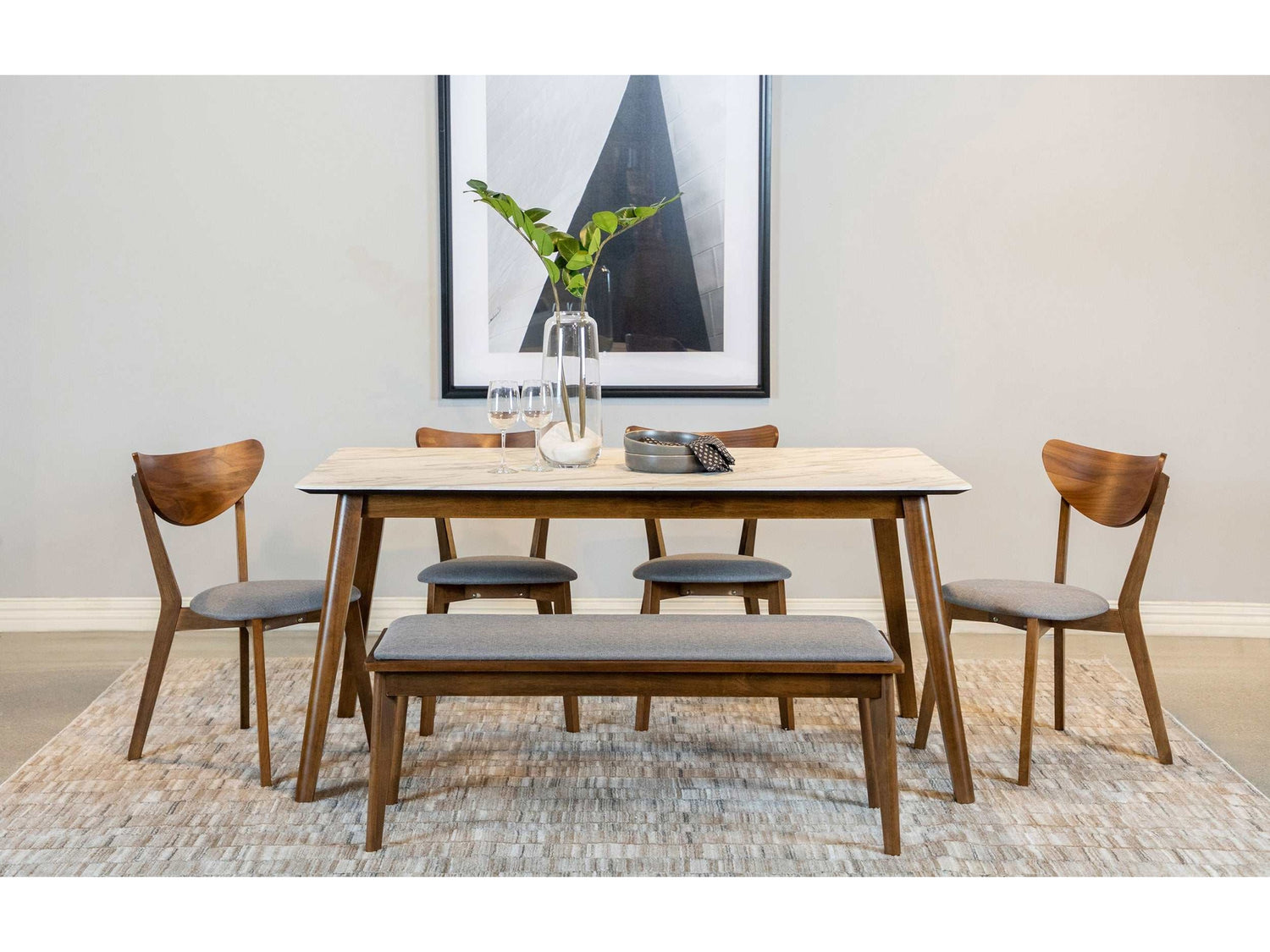 Dabble in a version of Swedish-Euro style to embellish your casual dining space, choosing this chic dining set. With a faux marble rectangular tabletop, its glam factor raises a bit and draws attention. Tapered, rounded legs made of natural walnut finish wood coordinate with charmingly angled chair frames that include a sleek rounded back. Upholstery softens each chair and a space-expanding bench. Set includes a dining table, six armless side chairs, and a versatile dining bench.