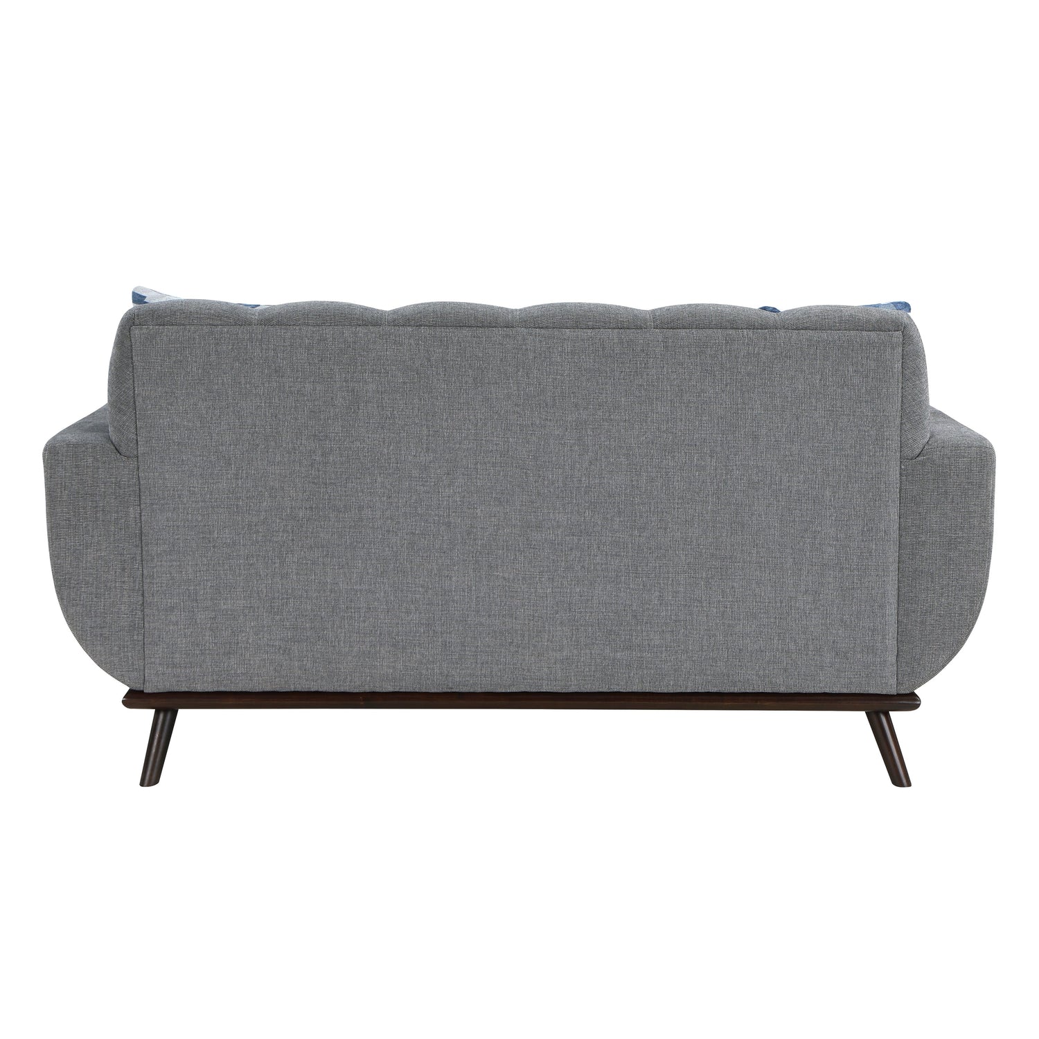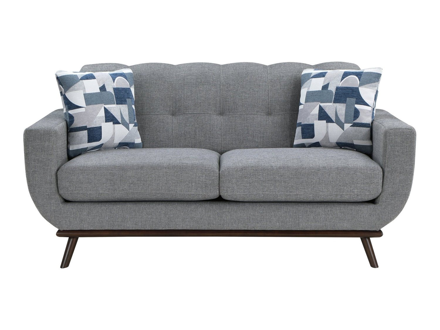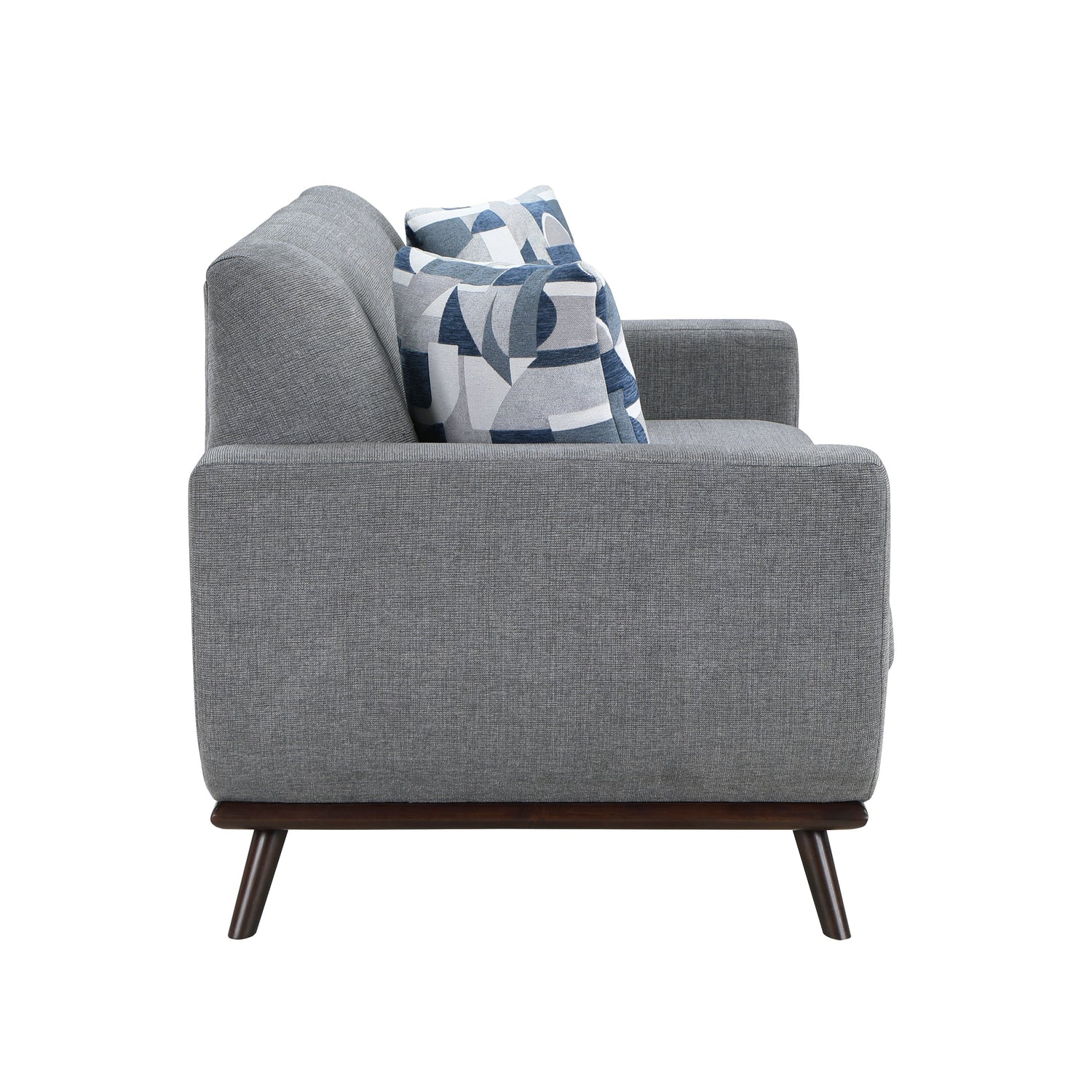 Mid-Century Modern inspired design comprises the timeless look of the Everton Collection. Gray chenille covers the modern framed love seat with geometric print toss pillows, walnut-finished wood base rail and legs providing complementing accent to the group. Contour stitching lends scalloped detail to the seatback’s profile, and front, while the prominent framing of the collection’s arms solidifies the retro-inspired form. The collection also features reversible seat cushions.