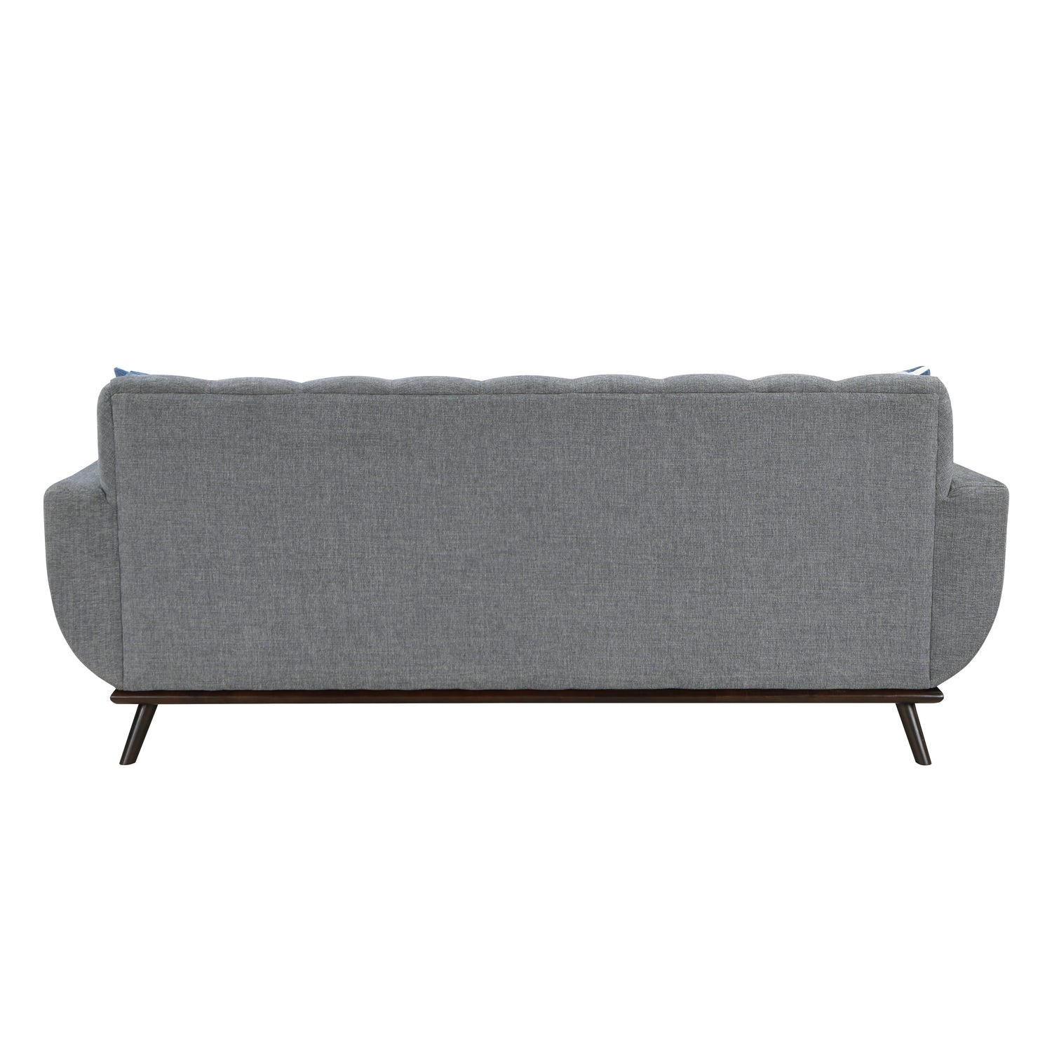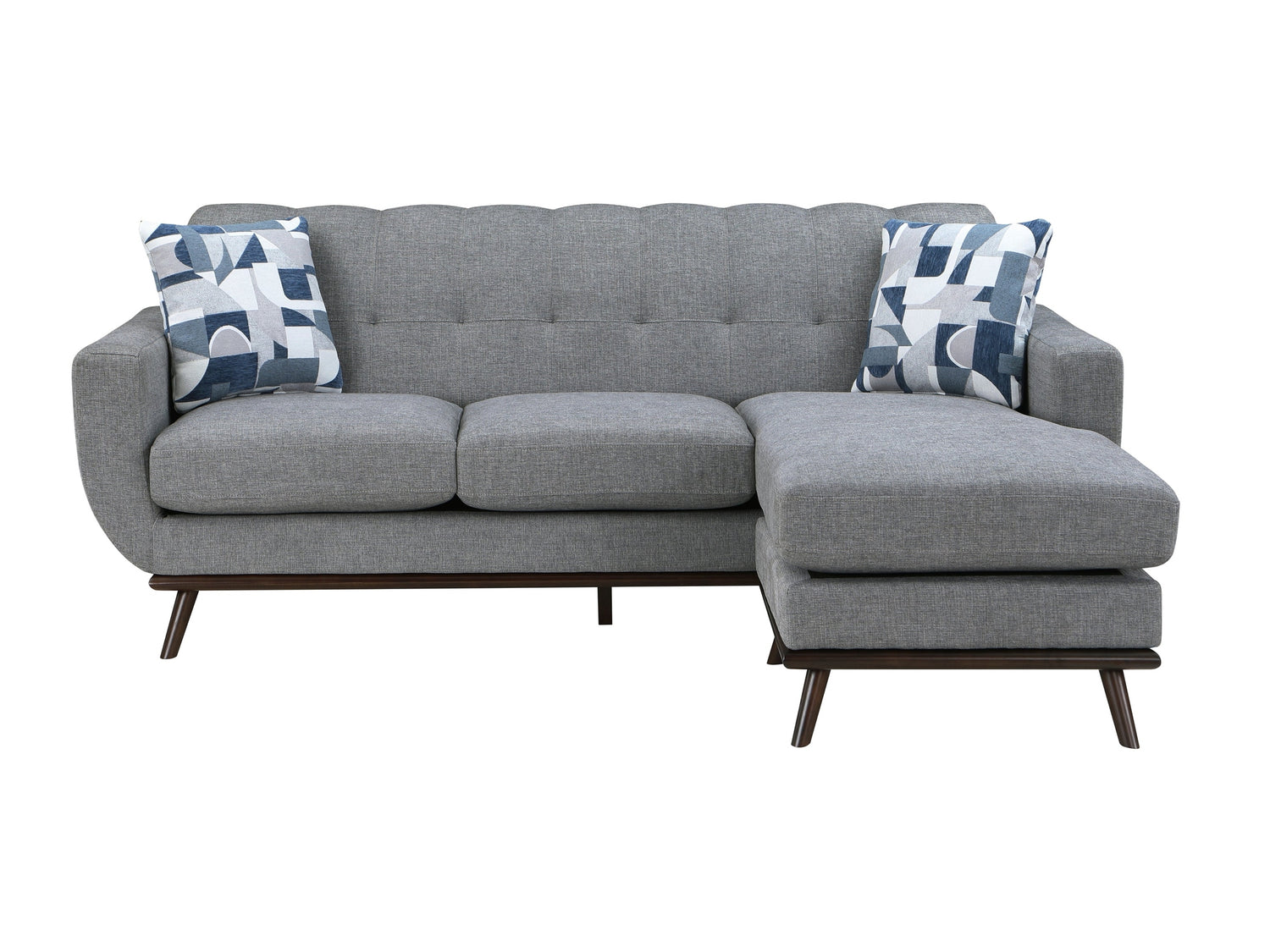 Mid-Century Modern inspired design comprises the timeless look of the Everton Collection. The sofa-chaise’s configuration allows for left or right-side placement of the extension ottoman for a perfect fit within your space. Gray chenille covers the modern frame with geometric print toss pillows, walnut-finished wood base rail and legs providing complementing accent to the group. Contour stitching lends scalloped detail to the seatback’s profile, and front, while the prominent framing of the sofa-chaise’s arms solidifies it retro-inspired form. The collection also features reversible seat cushions.