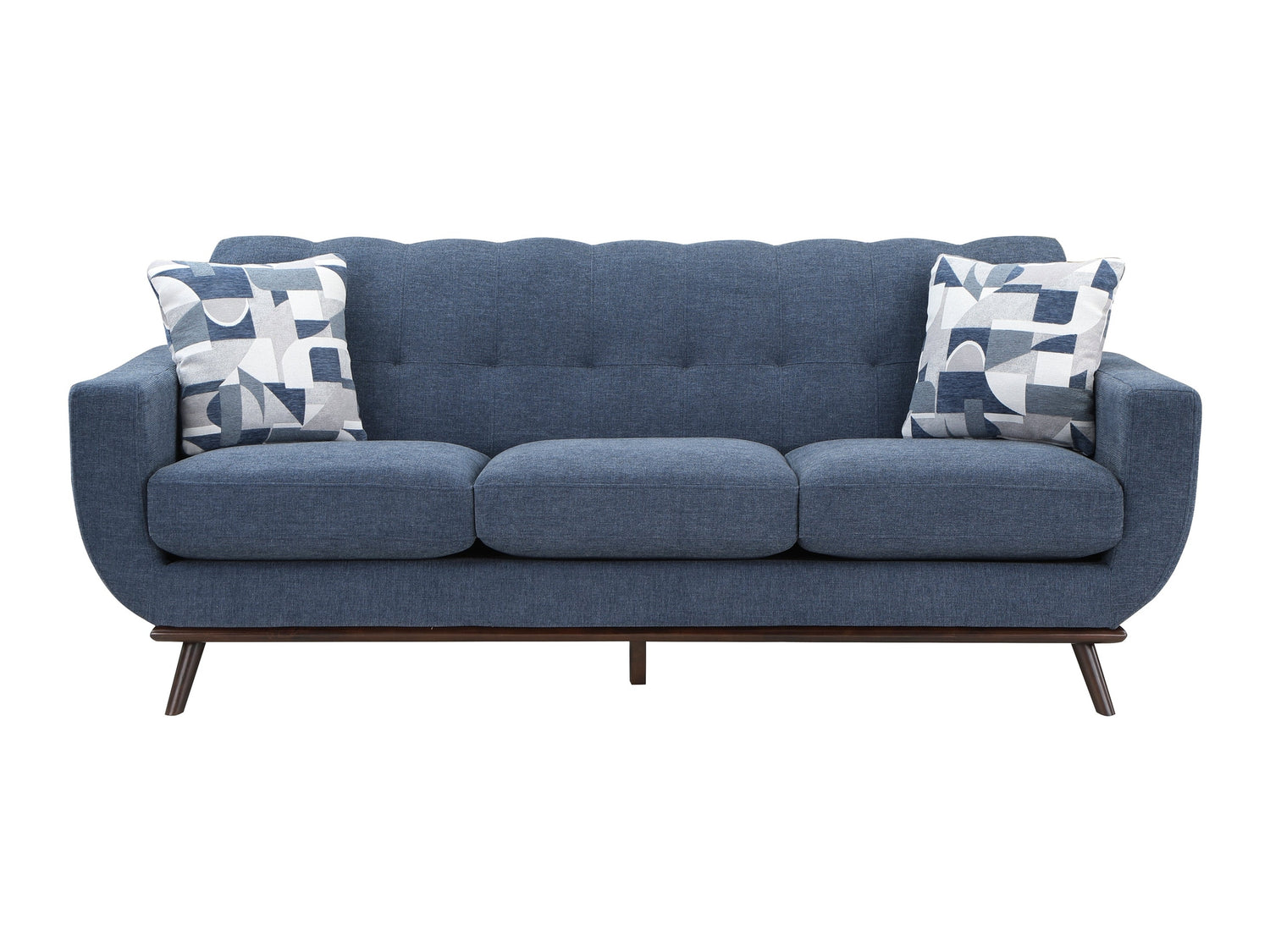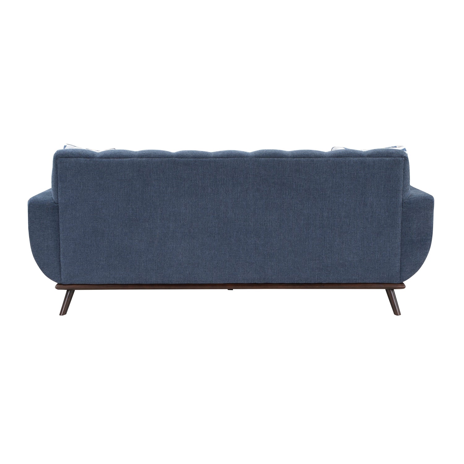 Mid-Century Modern inspired design comprises the timeless look of the Everton Collection. Blue chenille covers the modern framed sofa with geometric print toss pillows, walnut-finished wood base rail and legs providing complementing accent to the group. Contour stitching lends scalloped detail to the seatback’s profile, and front, while the prominent framing of the collection’s arms solidifies the retro-inspired form. The collection also features reversible seat cushions.