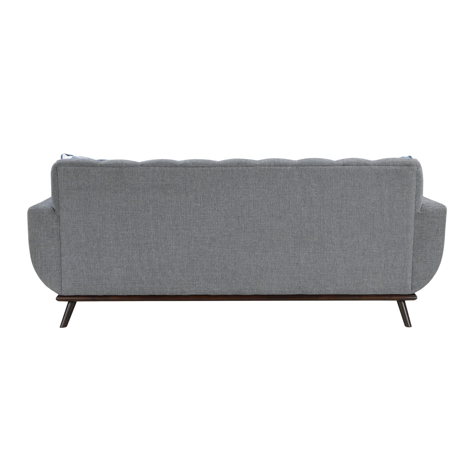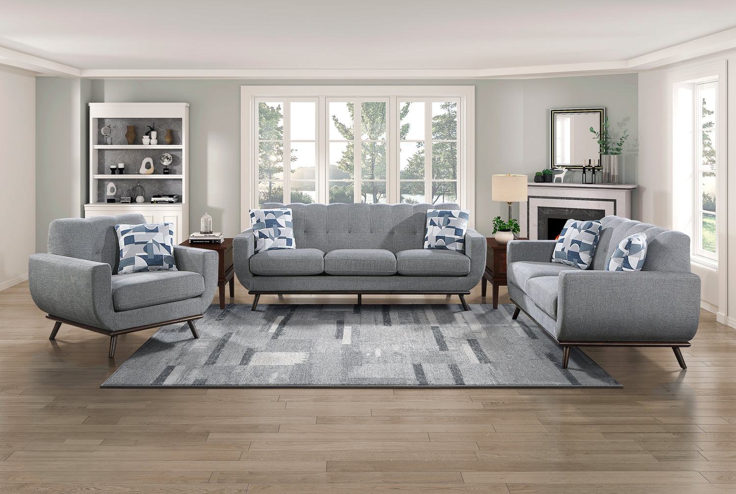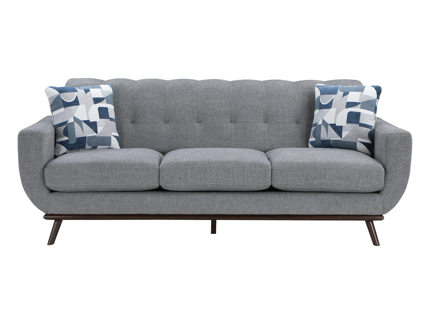 Mid-Century Modern inspired design comprises the timeless look of the Everton Collection. Gray chenille covers the modern framed sofa with geometric print toss pillows, walnut-finished wood base rail and legs providing complementing accent to the group. Contour stitching lends scalloped detail to the seatback’s profile, and front, while the prominent framing of the collection’s arms solidifies the retro-inspired form. The collection also features reversible seat cushions.