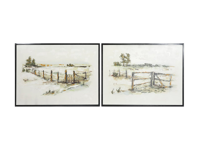 - Two-piece hand-painted landscape set with rustic fence and field scenes