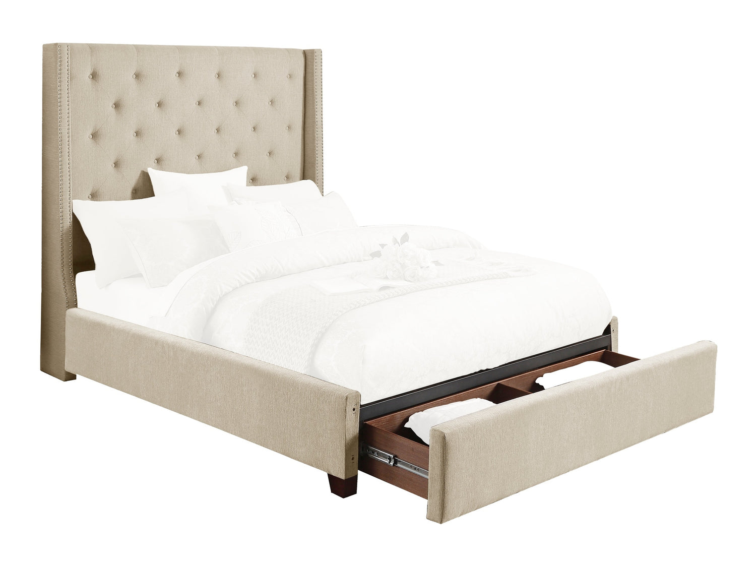 The stately profile of the Fairborn Collection will lend an air of understated elegance to your bedroom. The California King mansion headboard features nailhead accent and button tufting creating a modern traditional look that defines your personal style. Beige fabric covers the bed, providing neutral complement to your decorative bedding. Providing additional function to the bed is the footboard which extends to expose drawer space to meet your additional storage needs.