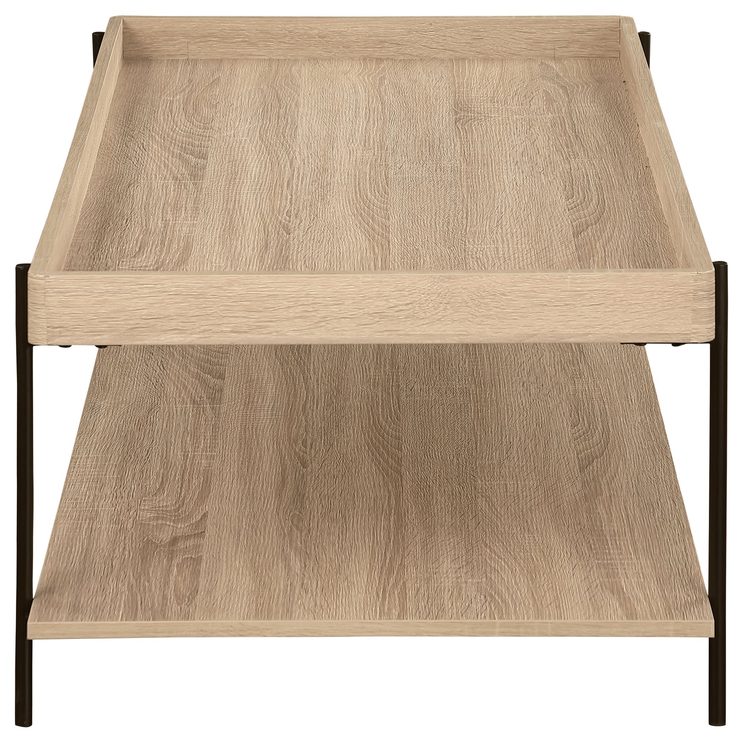 - Tray like tabletop in light brown wood grain finish creates depth and dimensionality