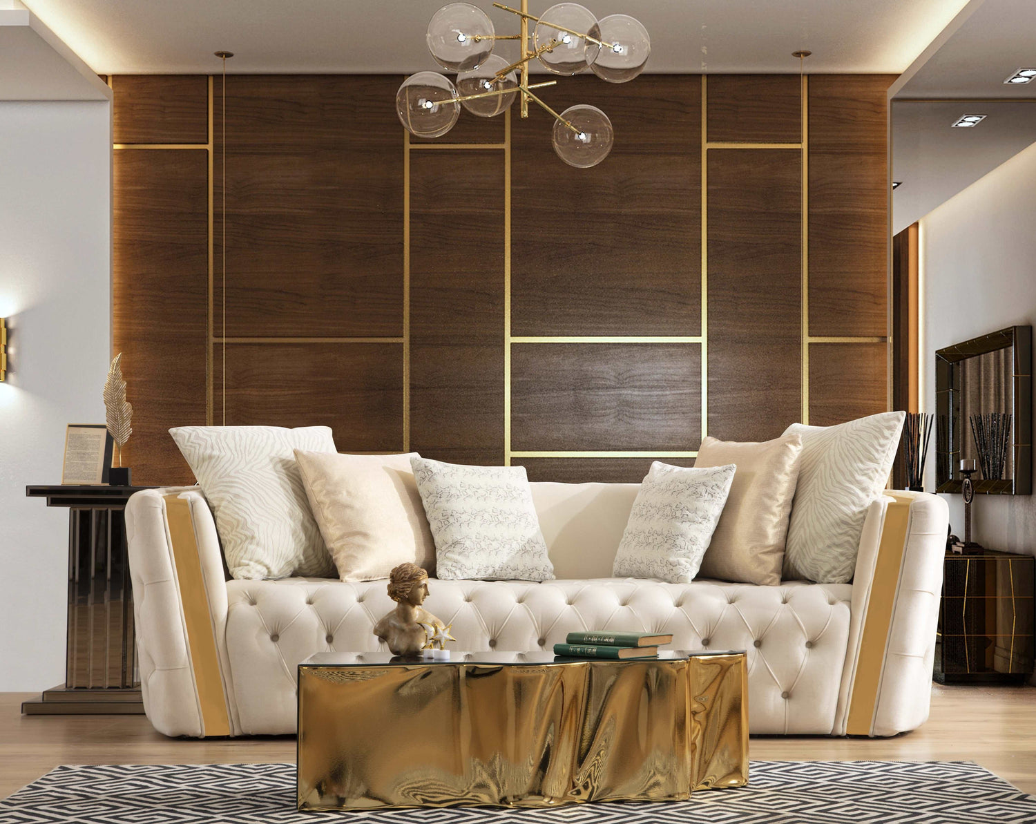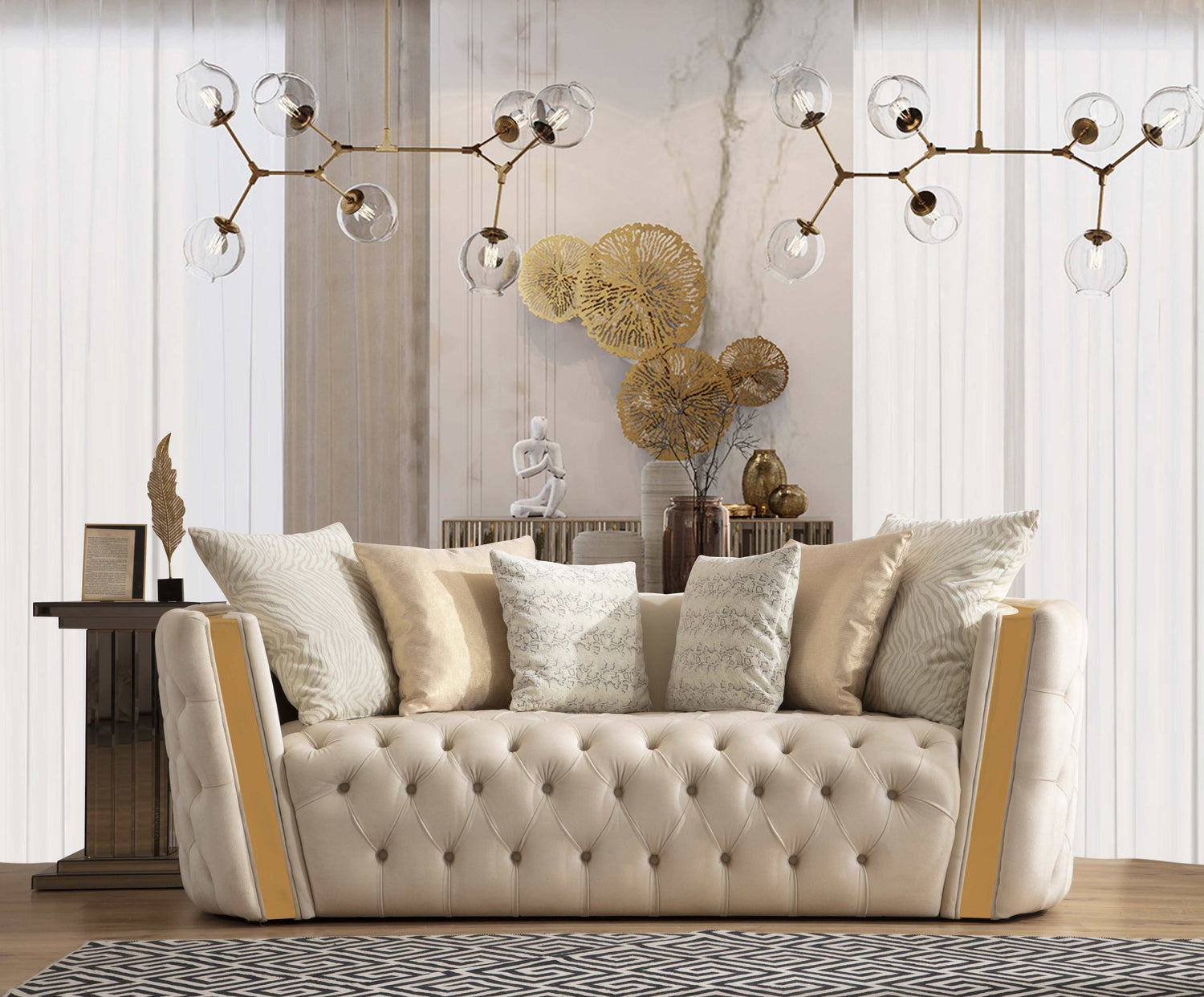 Featuring beautiful button-tufted arms and seats. The Fanci Collection gives a classic-modern decor. High-density foam padding provides maximum comfort. Fanci has a luxurious, glamorous look that can change the aura of your living room. The gold details are sibu material which is durable, tear-resistant, easy to clean, and dimensionally stable.