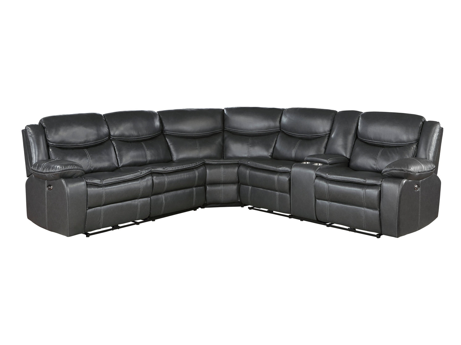 Designed to provide ample seating in your casual living room, the Fargo Collection utilizes a blend of comfort and function to create a perfect spot to chill out. The center seating unit is flanked by the dual power reclining seats of the right-side unit - its center console featuring cupholders, hidden storage, USB ports, and receptacles – and the left-side love seat with an end power recliner and stationary seat. Dark gray breathable faux leather covers the plush seating of the sectional.