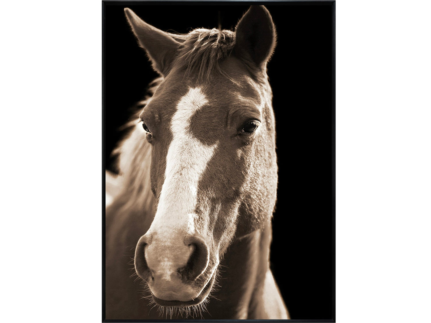 - Framed sepia-tone horse portrait showcases rustic beauty and strength