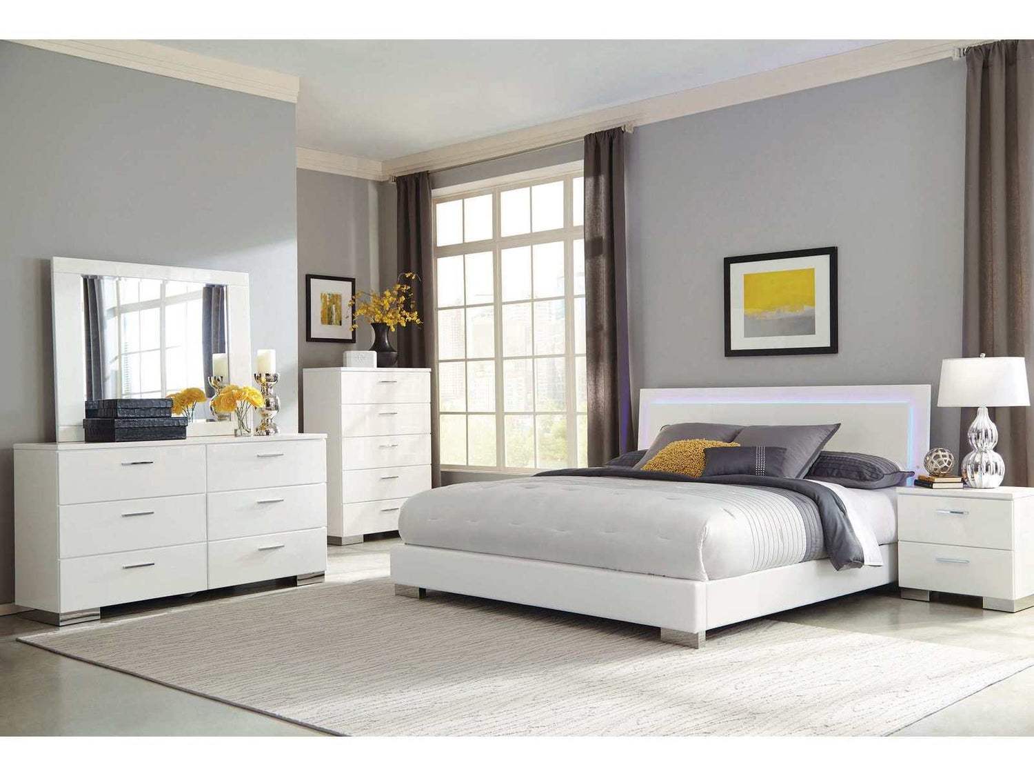 Felicity Glossy White 5pc Eastern King Panel Bedroom Set w/ LED Lighting