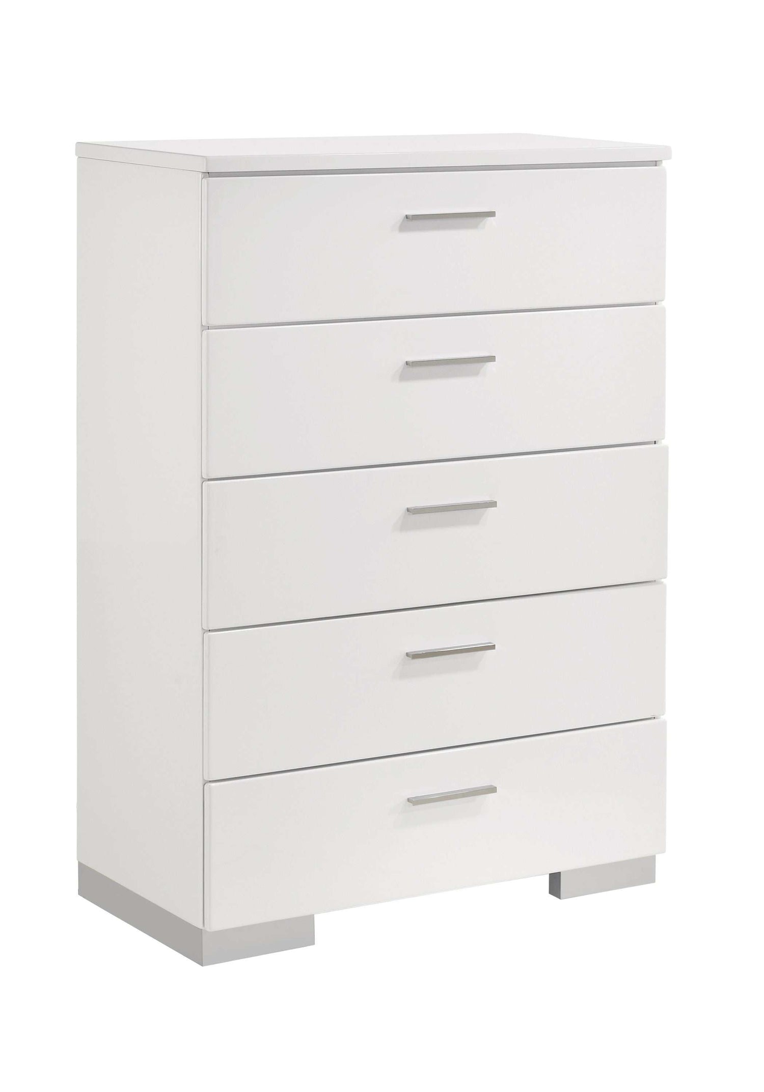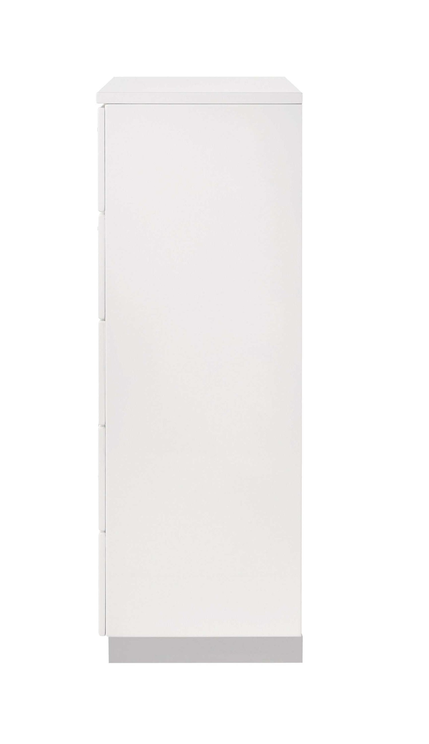 With graceful glamour and modern appeal, this five-drawer chest lends a touch of sophistication to any bedroom ensemble. Featuring high-quality wooden construction, it's a sturdy and durable option to accommodate your storage needs. Six roomy drawers offer plenty of space to organize your clothing and accessories. Expertly crafted, this dresser boasts a contemporary silhouette enhanced by a shining, polished chrome handle on each drawer. White polyurethane in a high-gloss finish accentuates its chic, contemporary style.