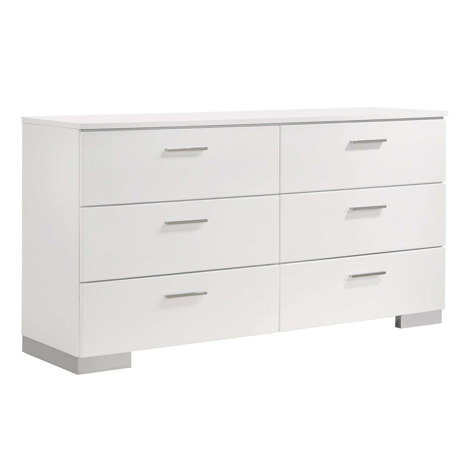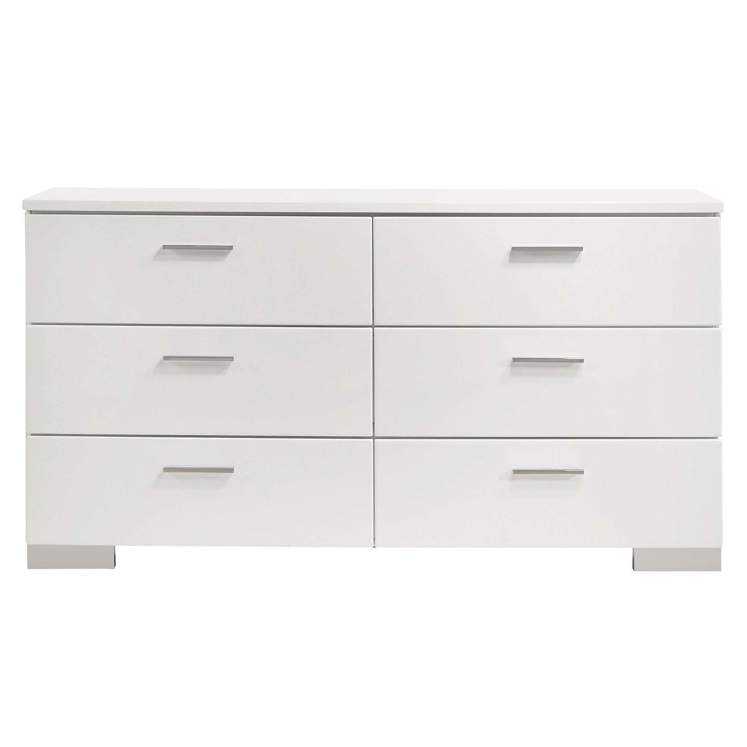 Organize your clothing collection in style with this sleek, chic, modern dresser. Its cool, contemporary design adds a touch of elegant simplicity to any bedroom. Six spacious storage drawers keep your wardrobe safe and secure. Constructed from wood with a high gloss white finish, its glamorous silhouette is thoroughly pleasing to the eye. Whether it's placed in a guest room or master suite, this dresser is an excellent option to meet your storage needs.