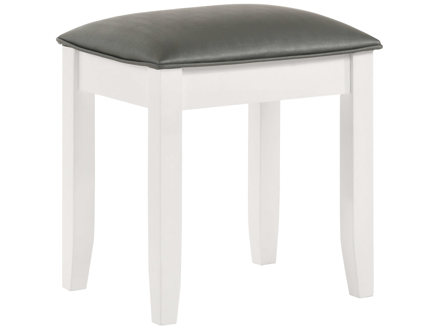 A versatile piece with nearly limitless functions, this modern vanity stool offers a fresh modern look. A glossy white polyurethane finish and upholstered seat breathe contemporary charm into a master bedroom, dressing space, or living area. Sit comfortably on a stool constructed of Asian hardwood and wood products. Add this stool to a bedroom vanity for a charming effect. Tapered legs offset the clean lines created by an inspiring design.