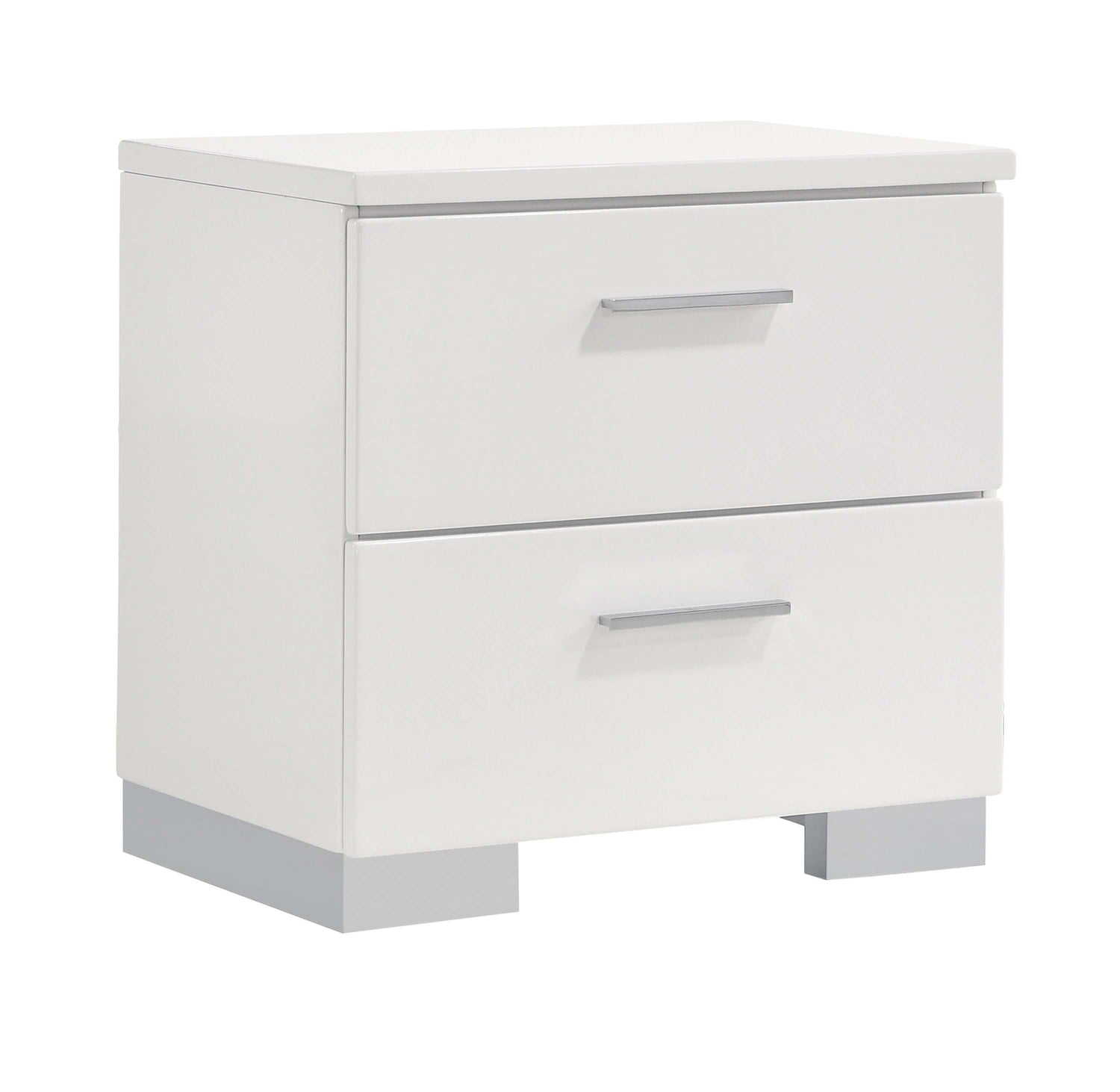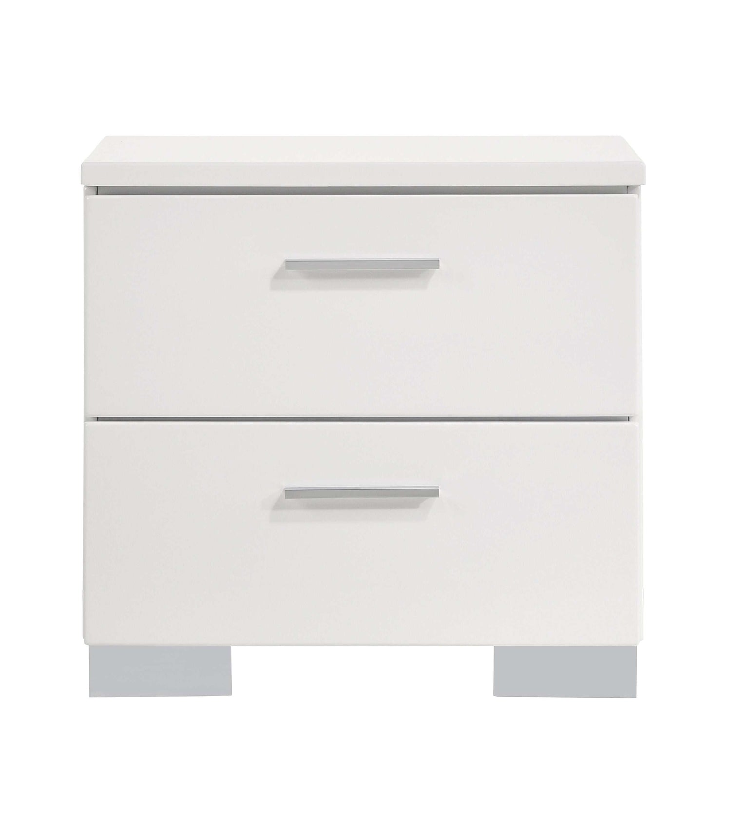 Tasteful and refined with a modern edge, this nightstand will instantly upgrade your bedroom's decor. Coated in white polyurethane with a high-gloss finish, it exudes cool, contemporary glamour. It comes complete with two large drawers for versatile storage. High-shine chrome adorns its handles and base supports, elevating its exquisite charm. Ideal for bedrooms of all shapes and sizes, this nightstand exudes elegant versatility.