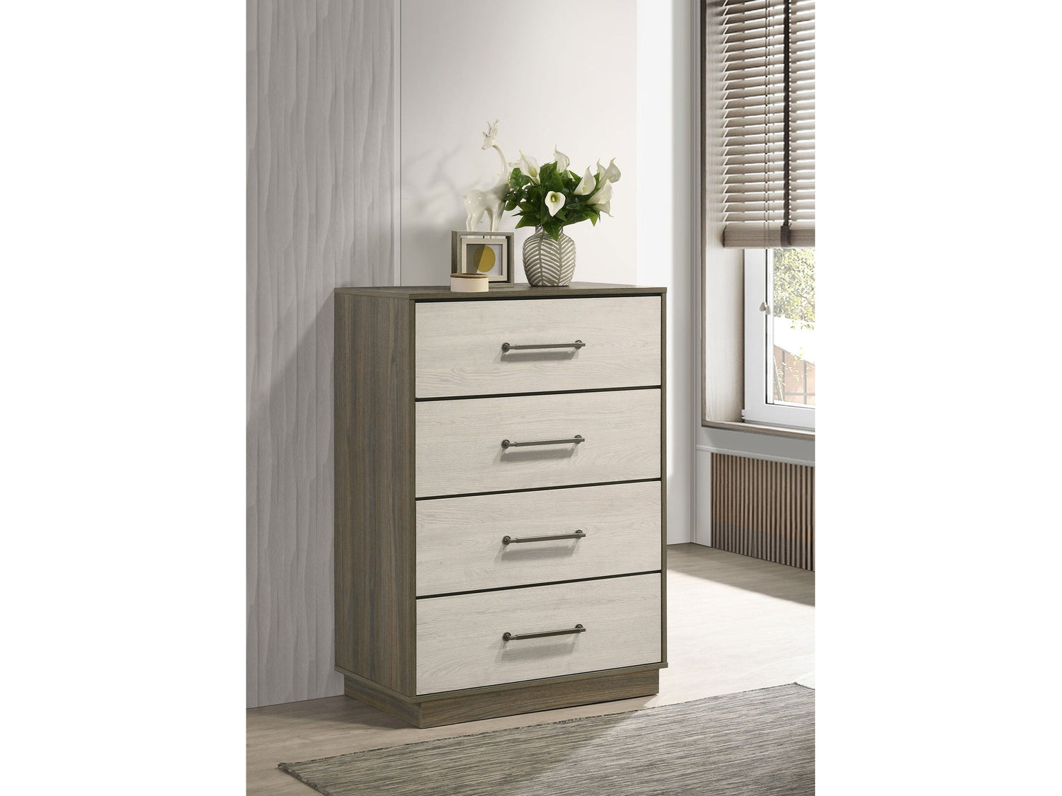 - Includes: One (1) chest- four drawer chest with a contemporary two tone melamine design