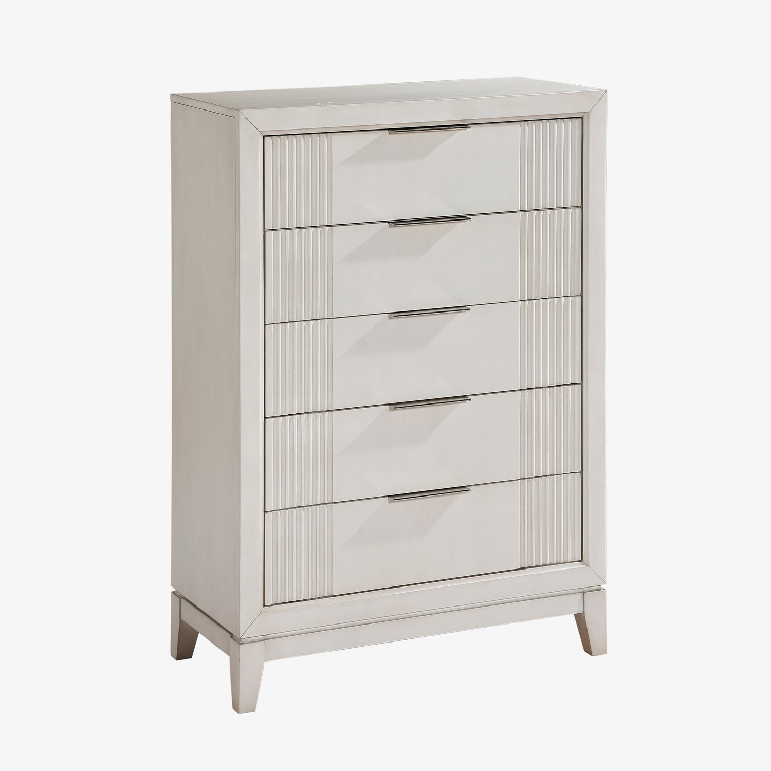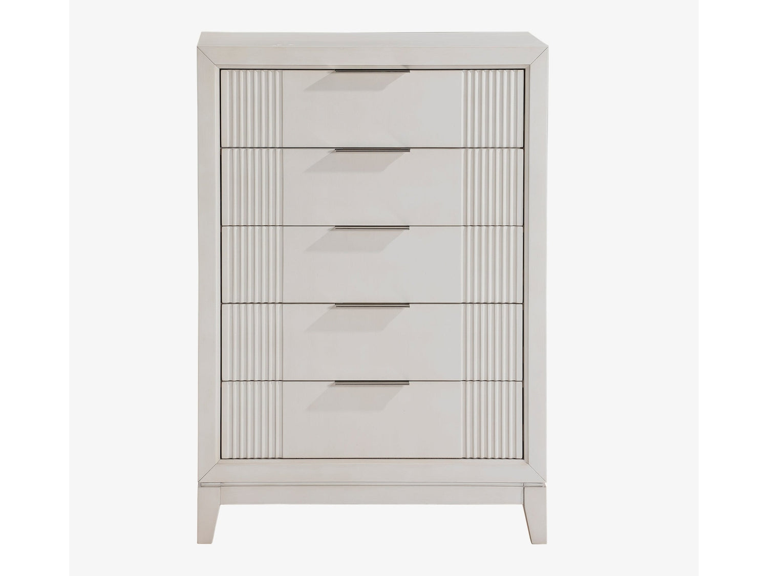 Subtle modern accenting inspires the classic design of the Florence Collection, each element pairing to create a visually appealing look for your bedroom. Reeded accenting fronts the drawers of the chest. Polished chrome edge-pull hardware centers each drawer front. The antique white finish of the collection lends a refreshing hue to your room’s décor.