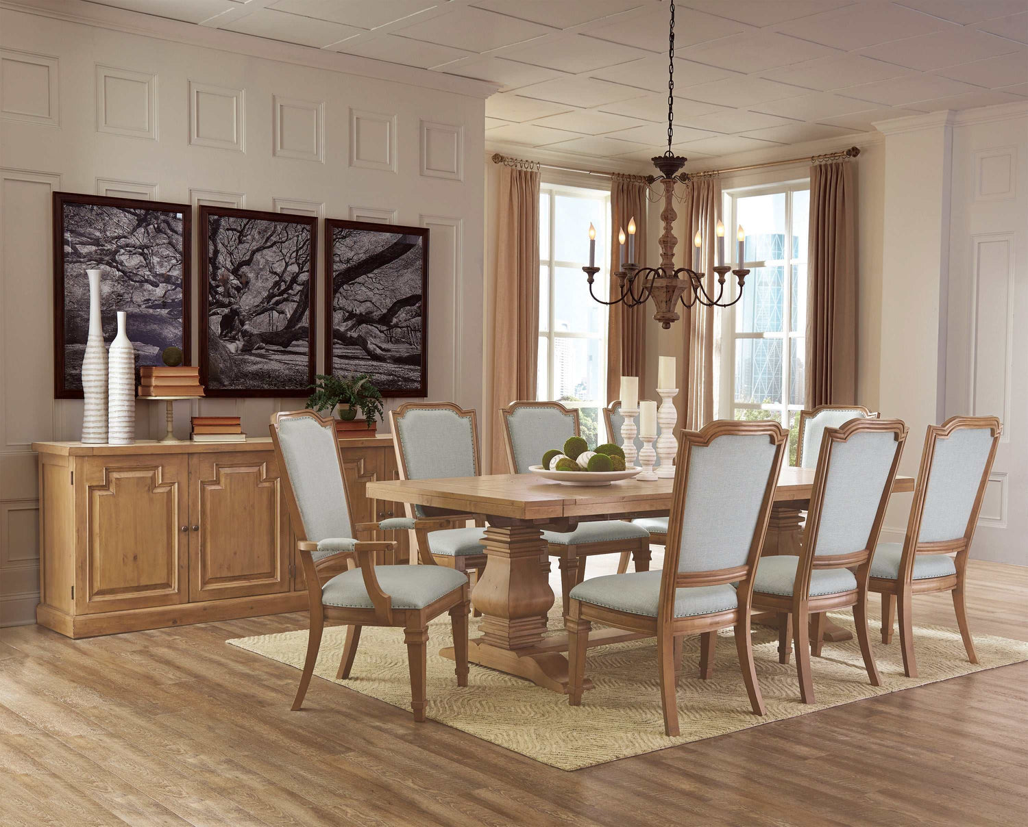 This rectangular extension dining table blends classic European elegance with artisan craftsmanship. Crafted from solid pine, it features a double pedestal trestle base that exudes romantic charm and timeless character. The sculpted pedestals, connected by a wide plank accent, create a striking focal point with an authentic handcrafted feel. A planked tabletop enhances its rustic appeal, while two 16-inch removable leaves extend the table up to 126 inches, making it perfect for gatherings large and small. Built for both beauty and durability, this table is an inviting centerpiece for any dining space.