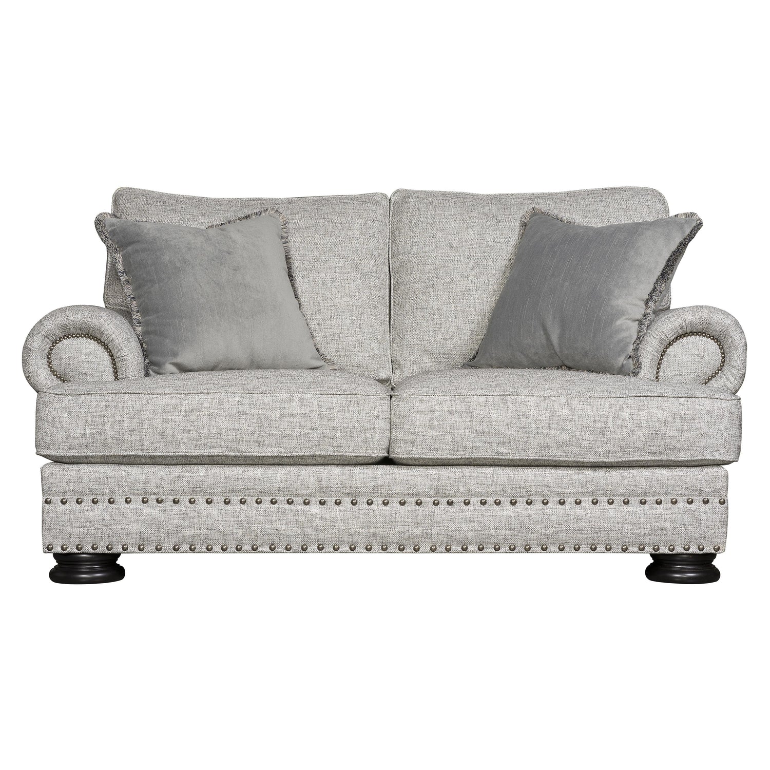 The Foster Grey Fabric Loveseat is a loveseat constructed from fabric upholstery that offers comfortable seating in a compact size. A padded frame and thick cushions provide necessary comfort. This design adds grandeur to any room.