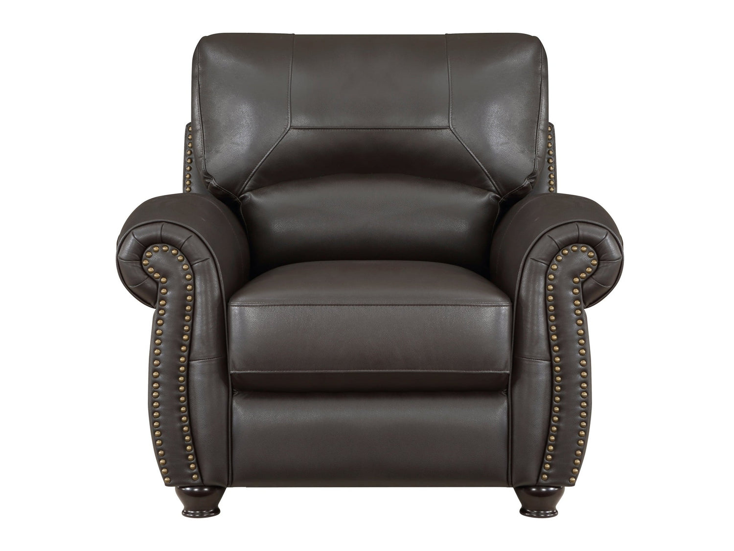 Traditional design and classic accents are paired to create the timeless look of the Foxborough Collection. Dark brown top-grain leather covers the plush seating of the chair everywhere the hand touches – with faux leather match covering the remaining areas. The profile of the seating arrangement is defined by elegantly rolled arms, plush seatbacks, and nailhead trim.