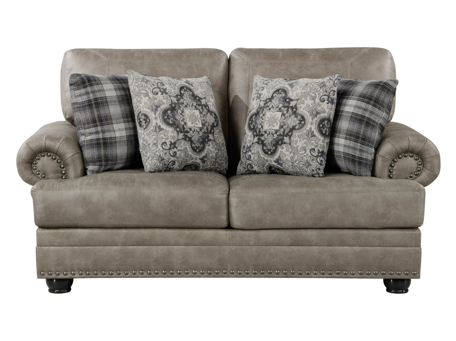 With a refined look that is steeped in traditional design, the Franklin Collection provides a timeless elegance to your living room. Mushroom-hued polished microfiber covers the frame of the love seat while traditional rolled arms, and nailhead trim provide classic detail to its profile. Contrasting toss pillows solidify the look, the floral and plaid designs an elegant pairing to complement your space.