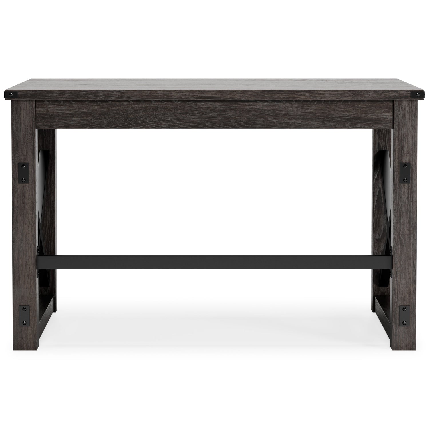 Love an urban farmhouse aesthetic? Make it work to your advantage with this beautifully styled desk. This simply striking choice in home office furniture has an unmistakable farmhouse feel thanks to design elements including a gray decorative wood grain laminate contrasted with crossbuck rails, metal accents and a stretcher in black. Perfect for office supplies, the desk includes a handy center drawer with hardware-less aesthetic to help keep your desk top clutter free