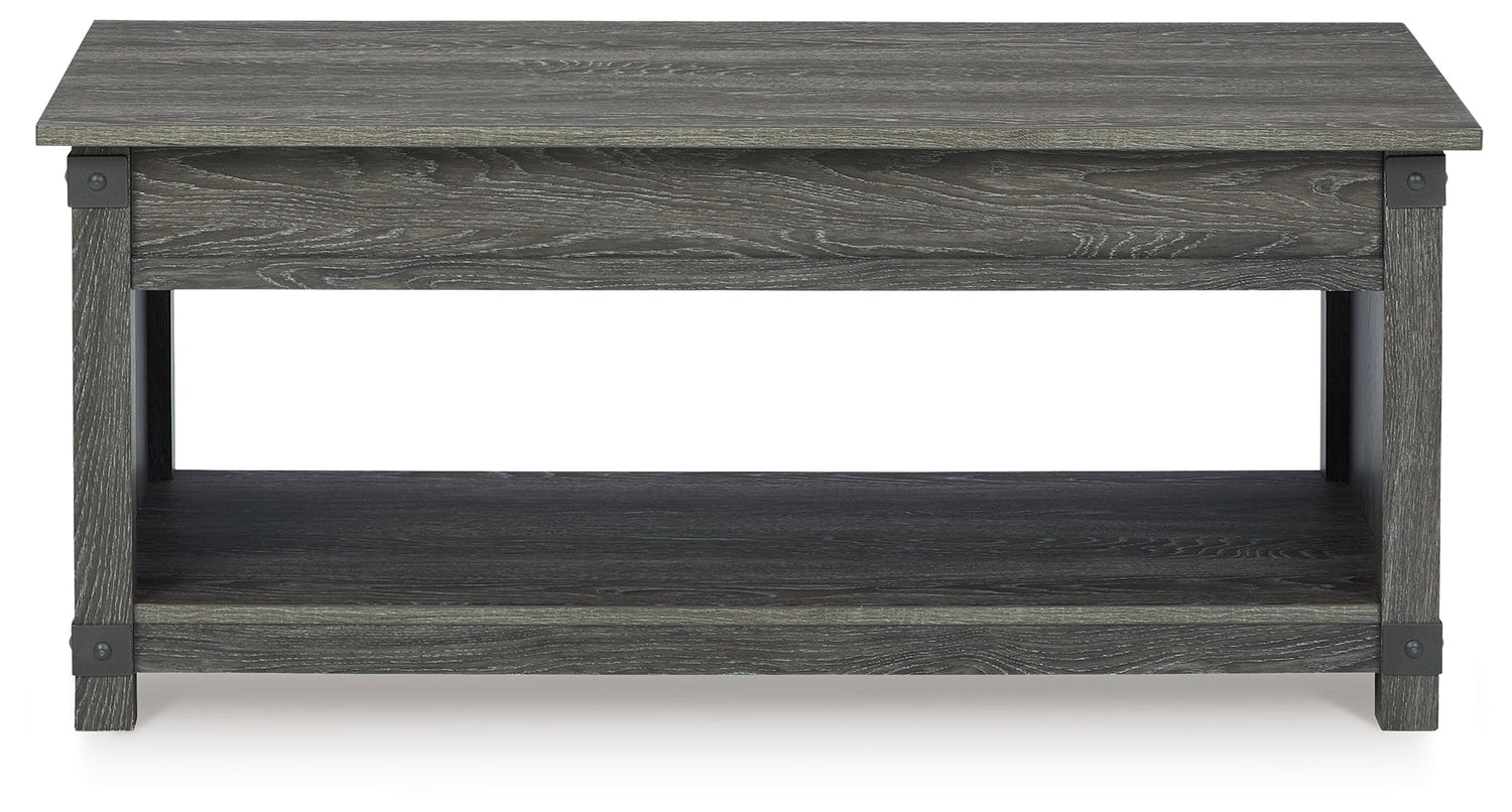 Open the door to modern farmhouse style with this lift-top coffee table. The beautiful woodgrain look and classic crossbuck metal accents are a cool touch, while the lower shelf provides surface space for fashionable home accessories. Sporting a gray replicated wood grain effect, its handy spring-loaded mechanism brings the tabletop closer to you. This versatile table makes it easier than ever to eat, work or play from the comfort of your sofa. 2 end tables and console included.