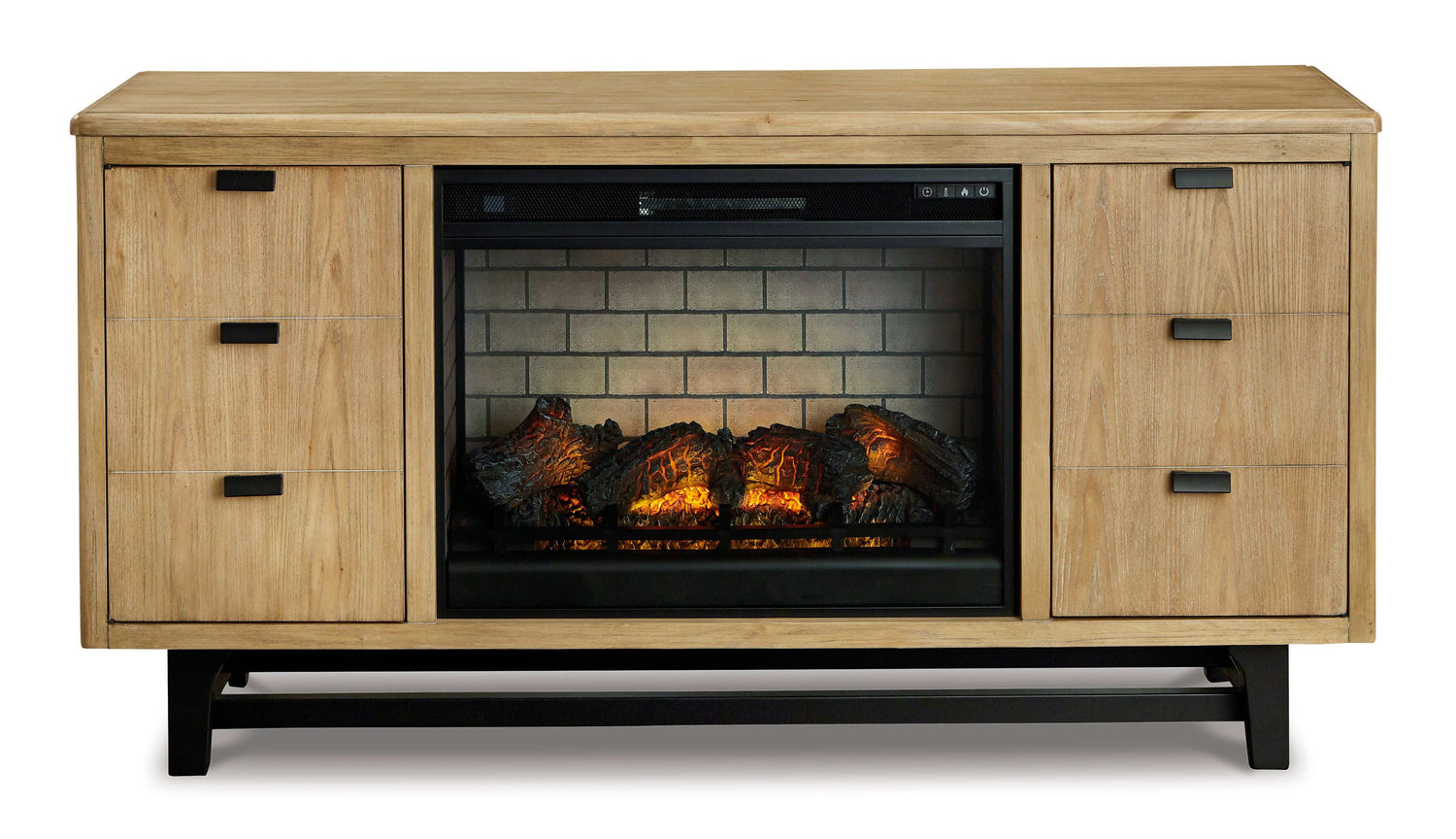 The fresh, organic look of this TV stand with an electric fireplace has a simple feel that complements your clean and cozy living room with ease. The natural tone has casual sensibility, while matte black legs add contemporary flair. What turns up the heat: an electric infrared fireplace insert with faux firebrick surround that operates with or without infrared heat. It includes a multi-flame feature, a 7-level temperature setting, five brightness levels, and an LED glowing embers effect.
