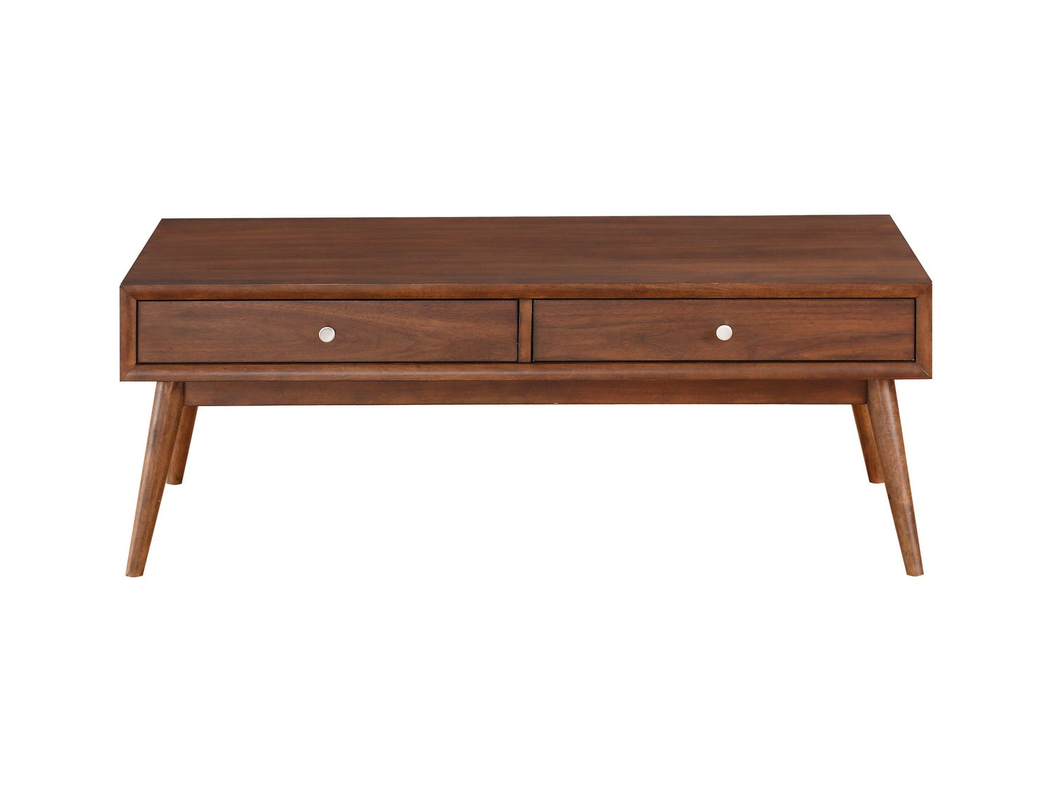 Providing functional use and retro-modern styling for your home is the Frolic Collection. The design of the cocktail table allows for the perfect placement within your home to accent your busy lifestyle. The brown finish combined with polished nickel knob hardware, drawer storage and a mid-century inspired profile, blend effortlessly to create this stylish table. Also available – cocktail table, end table, desk, standing desk, and home entertainment console.